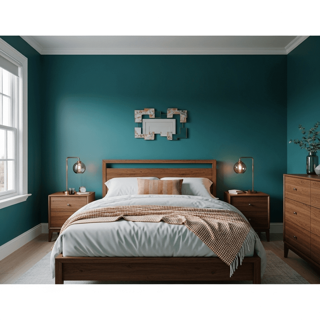 Teal is a versatile “bridge” color that feels both blue and green. When paired with metallic copper accents, it creates a rich, industrial-glam look that feels expensive and cozy.