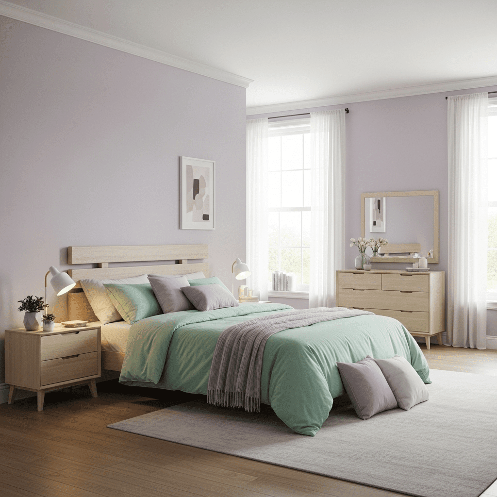 For a softer take on color, combine cool lavender with mint green. This “ice cream” palette is refreshing and airy, making small guest rooms feel light and playful.