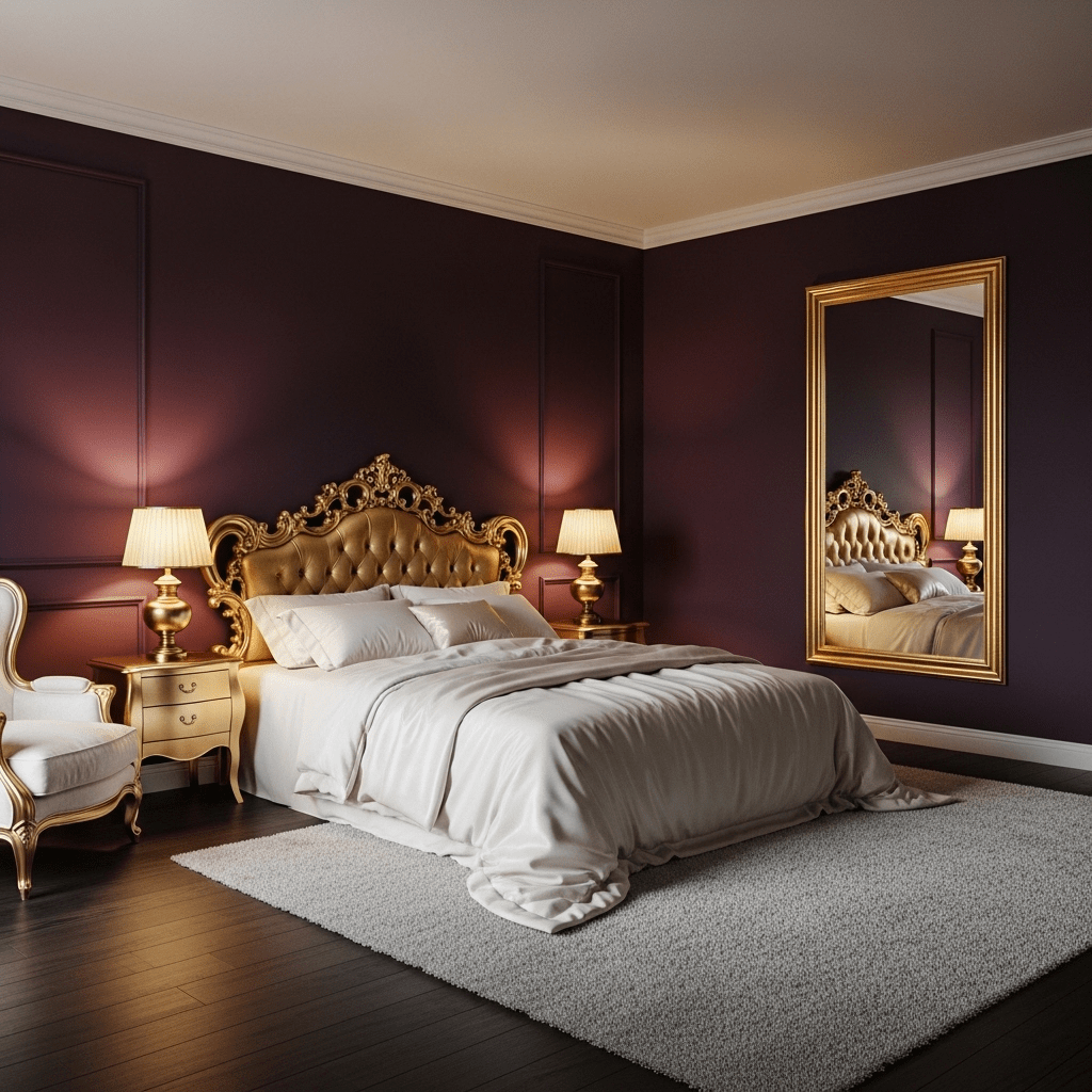 Plum is a regal, sophisticated color that feels more intimate than black or grey. Paired with gold frames and mirrors, it creates a “royal” guest experience.