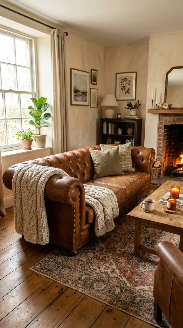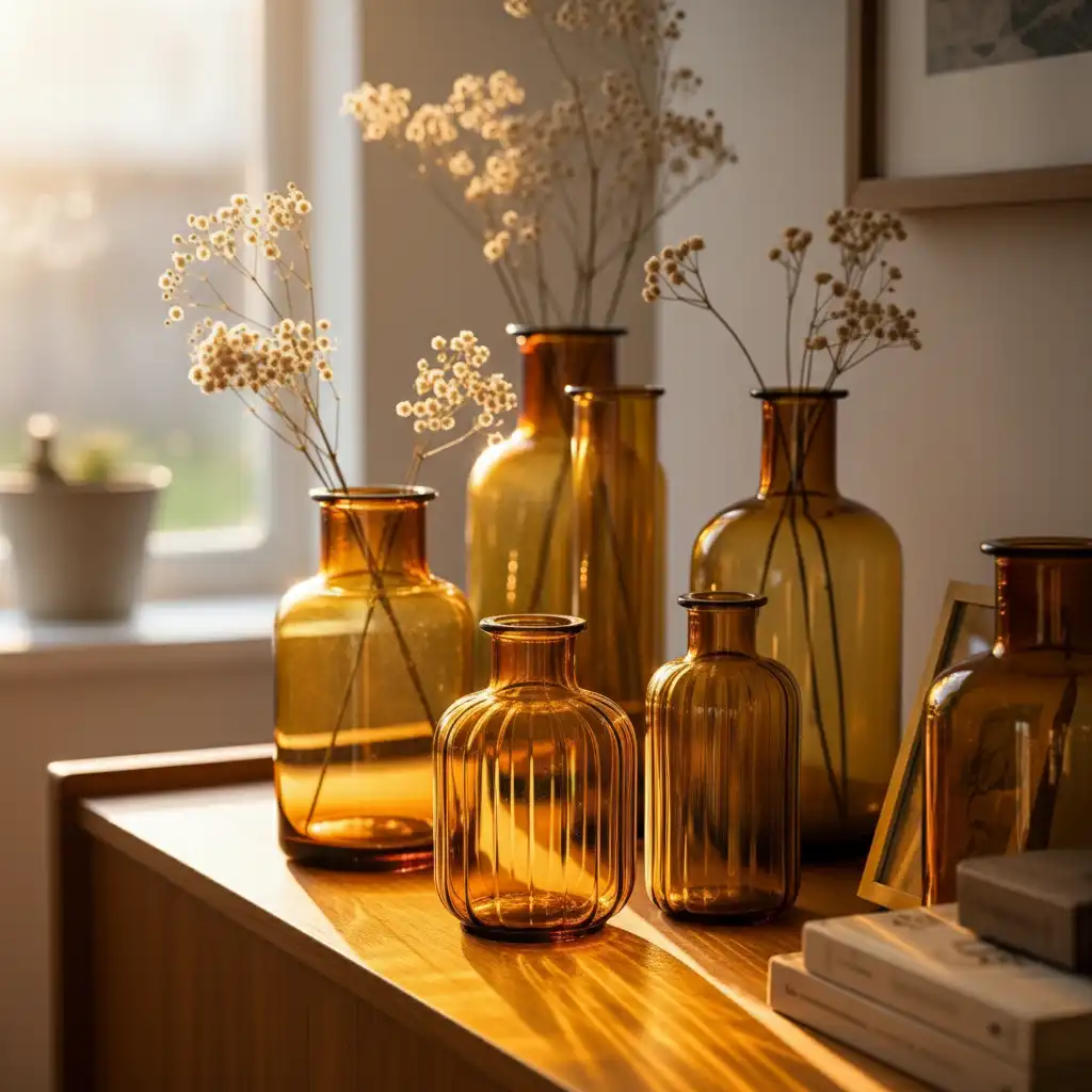 Decorate with amber or smoke-colored glass vases and lighting. These tones mimic the “golden hour” light, casting a warm, nostalgic glow across the room even on cloudy days.