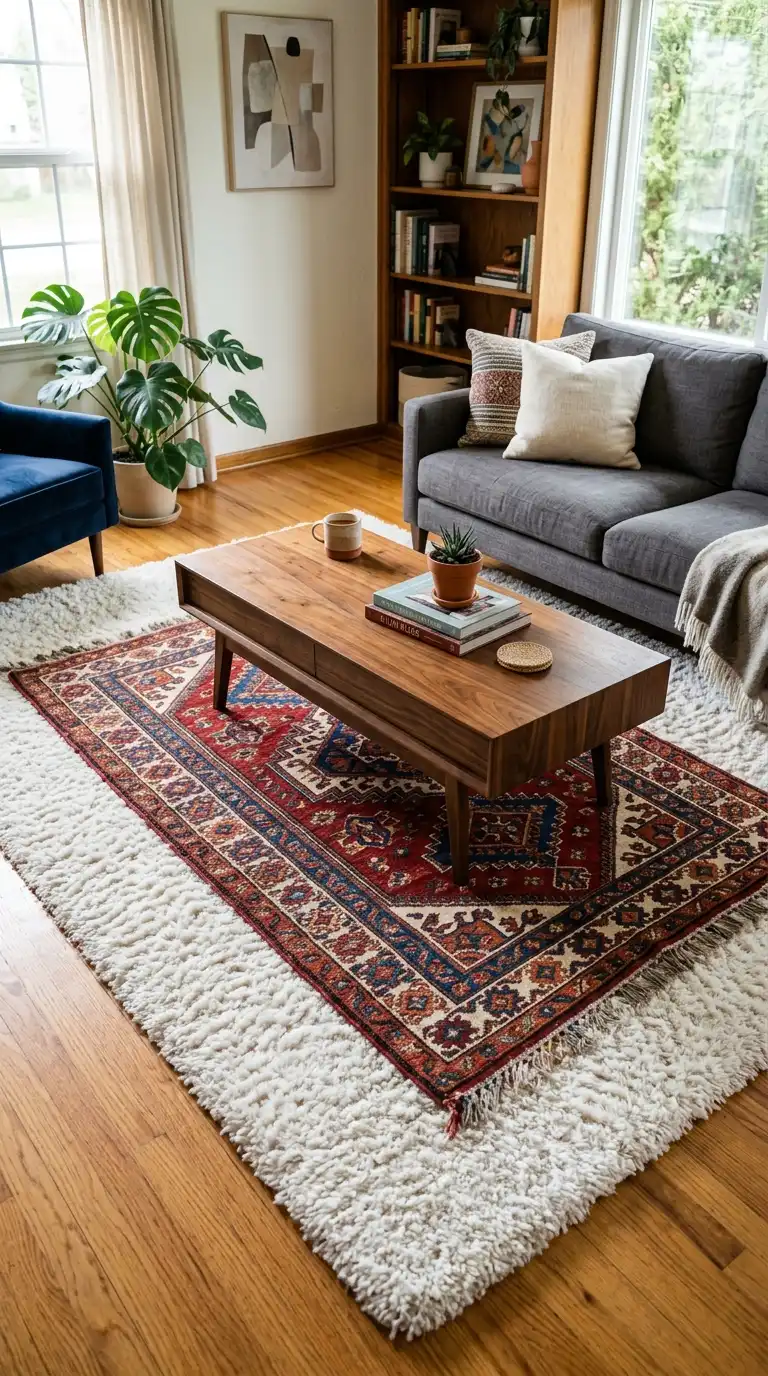 Place a colorful, geometric Kilim rug over a thick, high-pile white shag rug. This layering technique provides maximum underfoot cushion and a “boho-modern” sense of warmth.