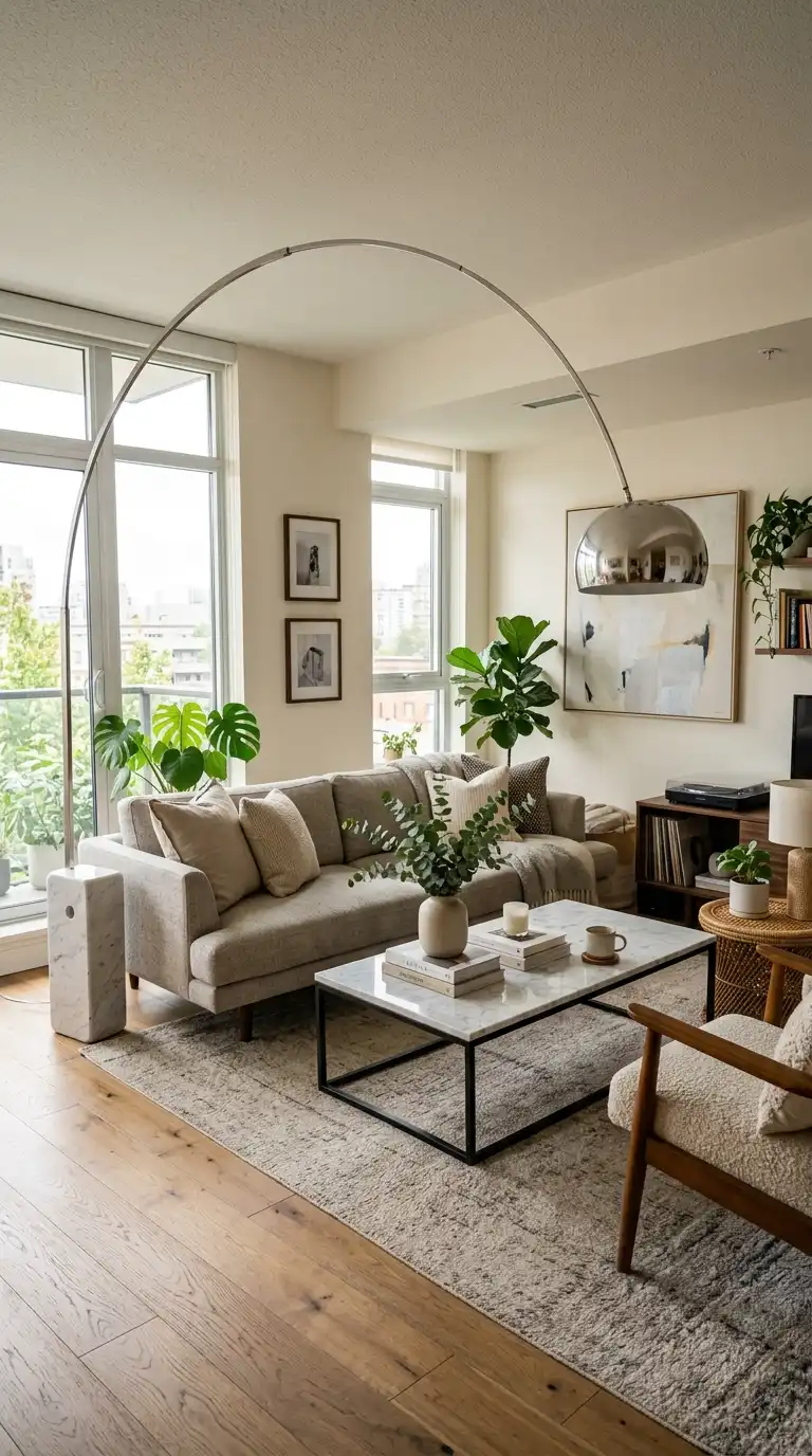 An iconic “Arc” lamp with a large dome shade allows you to bring light directly over a seating area without overhead wiring, creating a focused, intimate pool of light.
