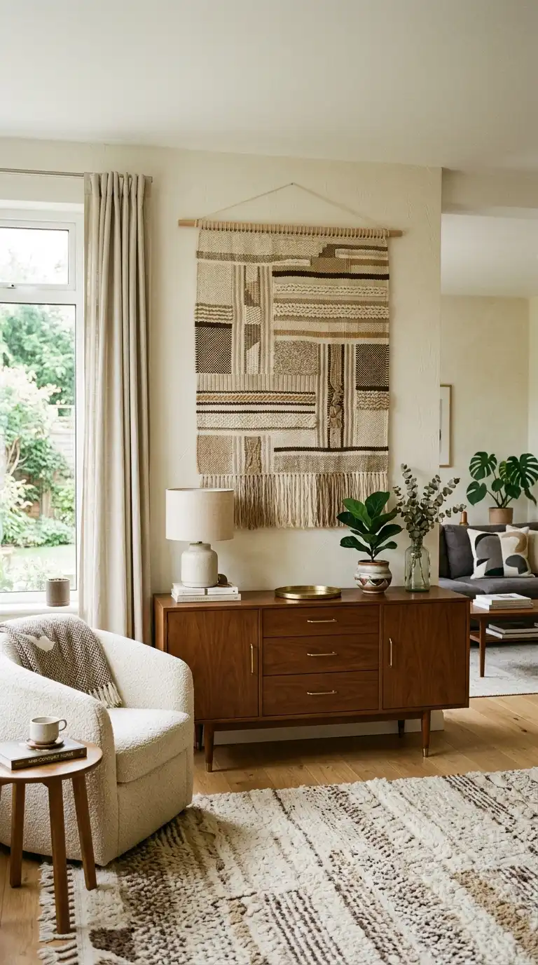 Decorate walls with woven textile art or framed fabric. These “soft” wall treatments absorb sound and add a handcrafted, tactile element that balances industrial furniture.