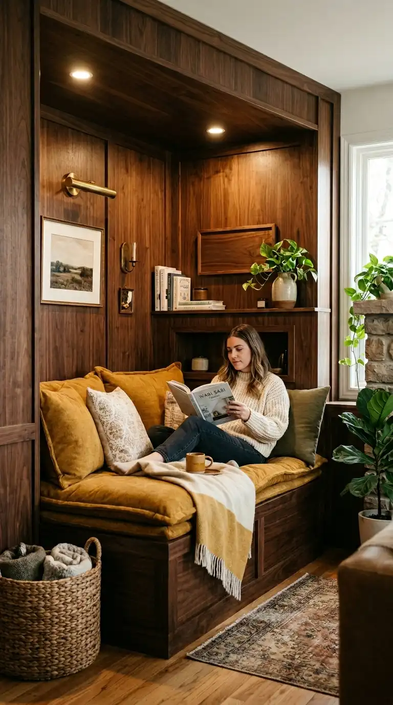 Clad a corner of the room in vertical walnut wood panels. The dark, organic wood creates a “cabin-like” enclosure that feels much cozier than cold, white drywall.