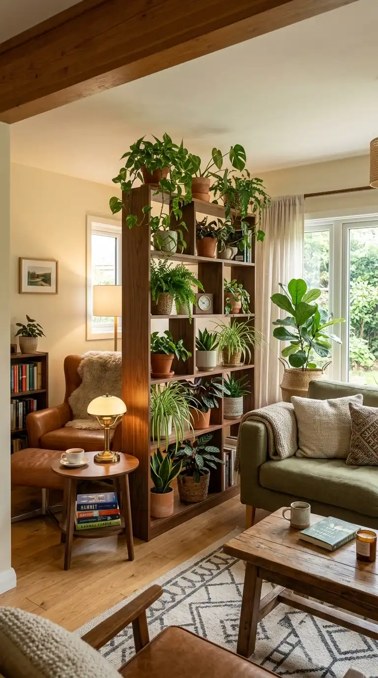 Use a tall, open-slat wood divider or a row of large plants like Sansevieria to create a semi-private zone. This “screen” adds a sense of leafy seclusion within a larger room.