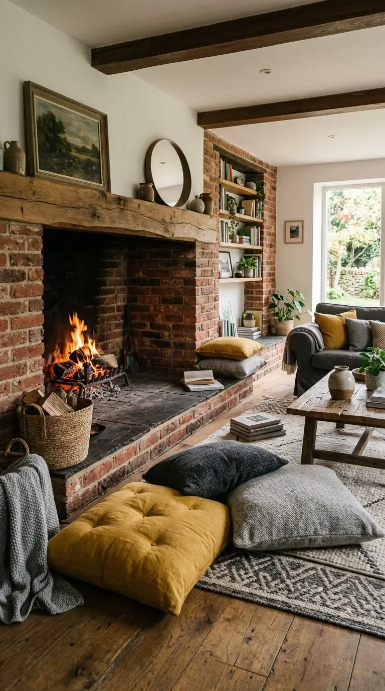 If you have a raised stone or brick hearth, skip the chairs and use oversized velvet floor cushions. This encourages a relaxed, informal way of lounging that feels very “retro-cool.”