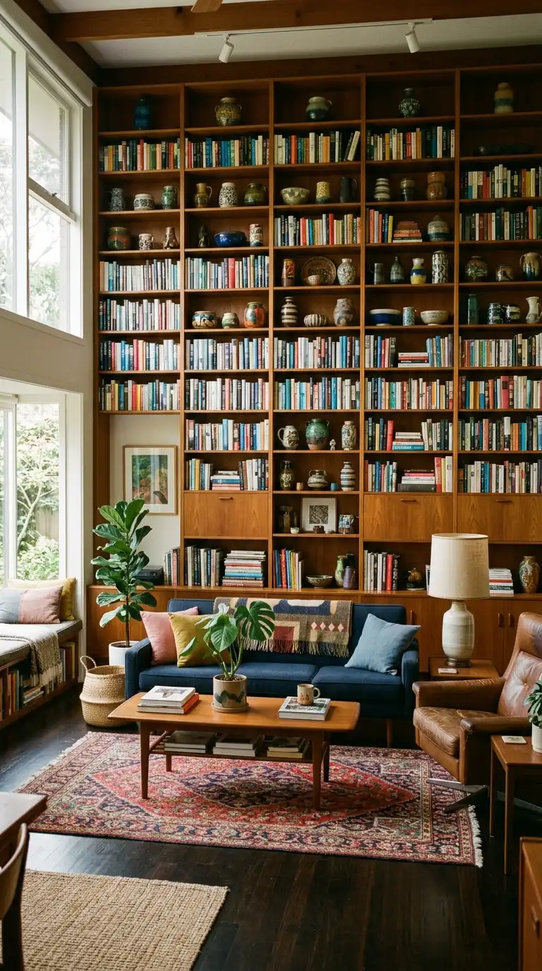 Fill a large teak “wall system” with books rather than just decor. The “visual noise” of book spines adds color, texture, and a sense of intellectual warmth to the room.