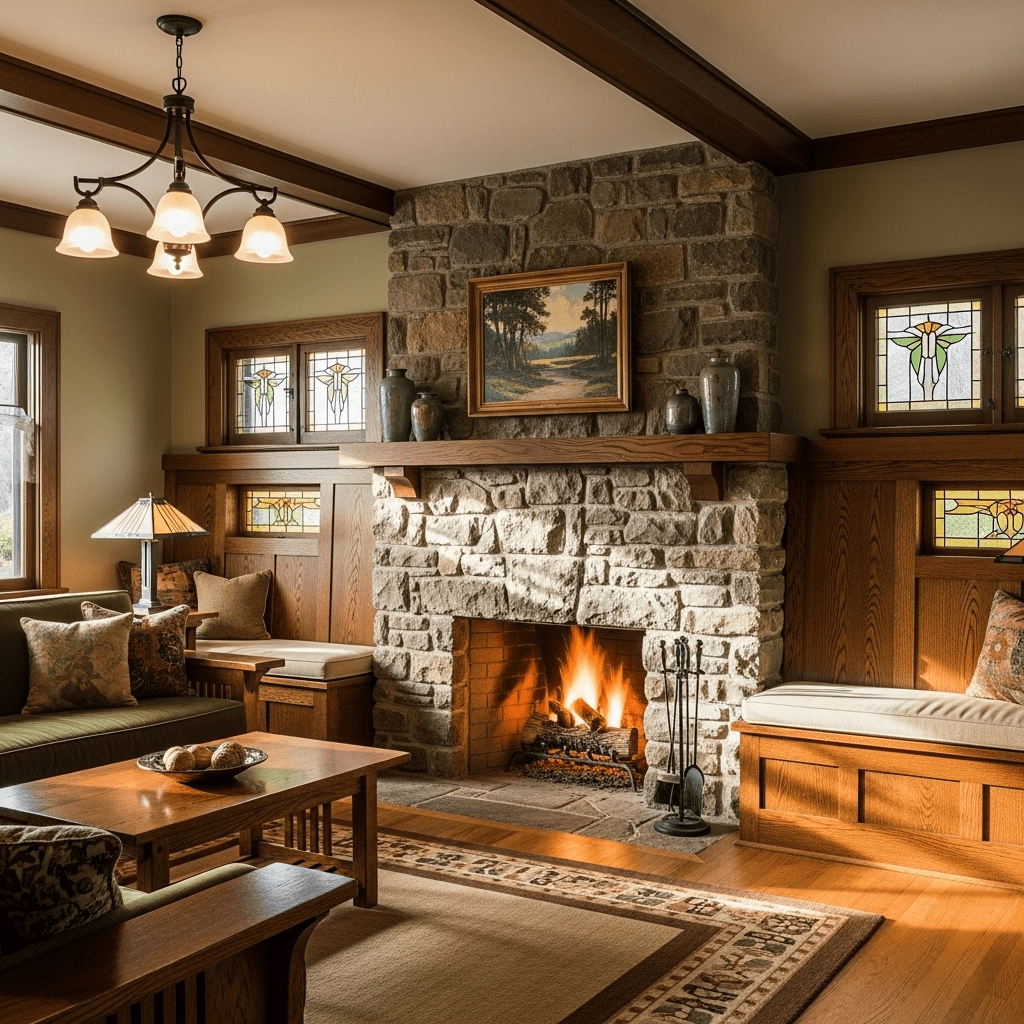 Creating a cozy “room within a room” by surrounding a stone or brick fireplace with built-in wooden benches and cabinetry. It is the ultimate expression of Craftsman warmth.