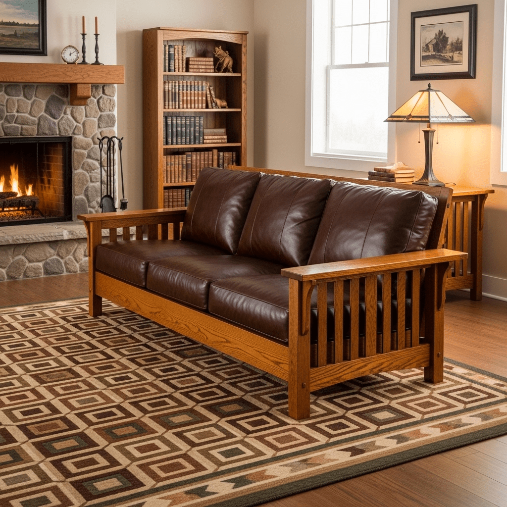 Centering the room around Mission-style sofas and chairs, known for their vertical wooden slats and thick leather or heavy fabric cushions.