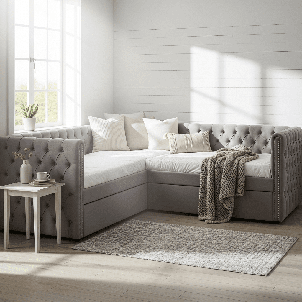 If you frequently host couples, opt for a daybed with a pop-up trundle. This hidden secondary mattress rises to the same height as the main bed, creating a seamless king-sized sleeping surface.