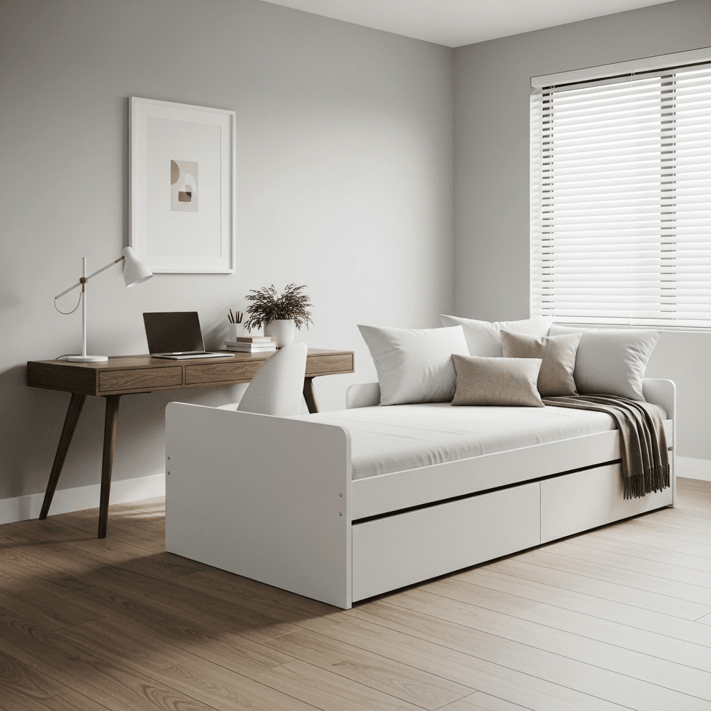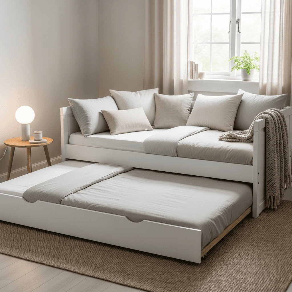 Use a daybed that features a slat-pull expansion. This allows the bed to stay as a compact twin during the day but expand into a large bed at night, maximizing the floor space of a small spare room.
