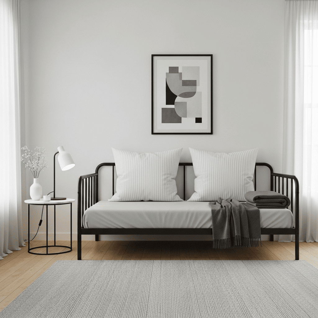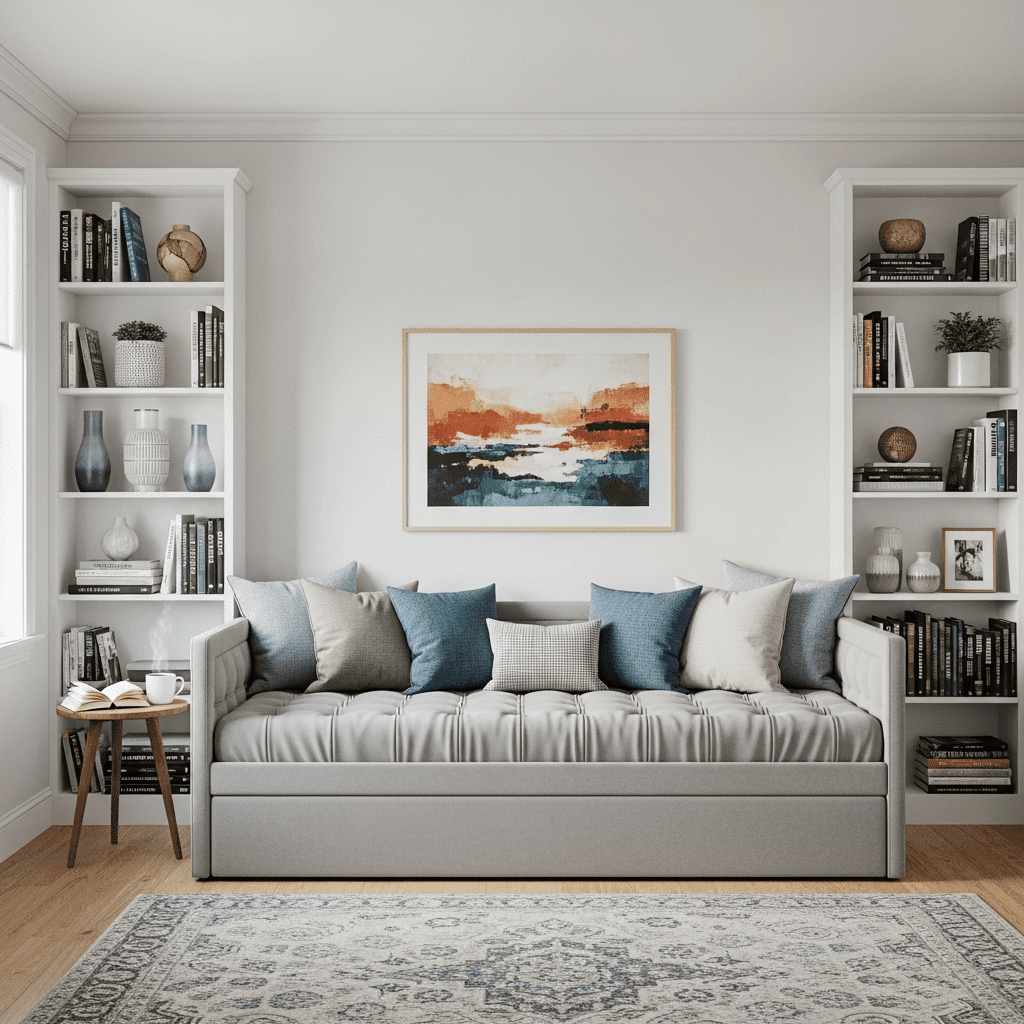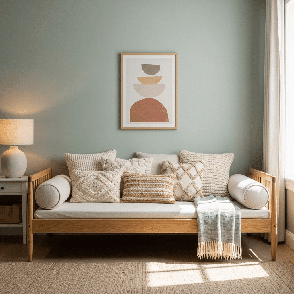 To make a daybed function as a true sofa, use oversized bolster pillows at each end. These provide armrest-like support and help define the furniture’s shape, making it look intentionally styled.