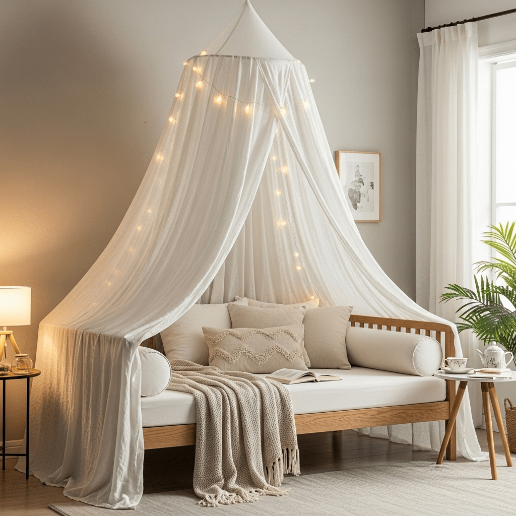 Drape fabric over a simple daybed frame or hang it from the ceiling to create a canopy. This adds a sense of privacy and “room-within-a-room” charm that guests will find enchanting.