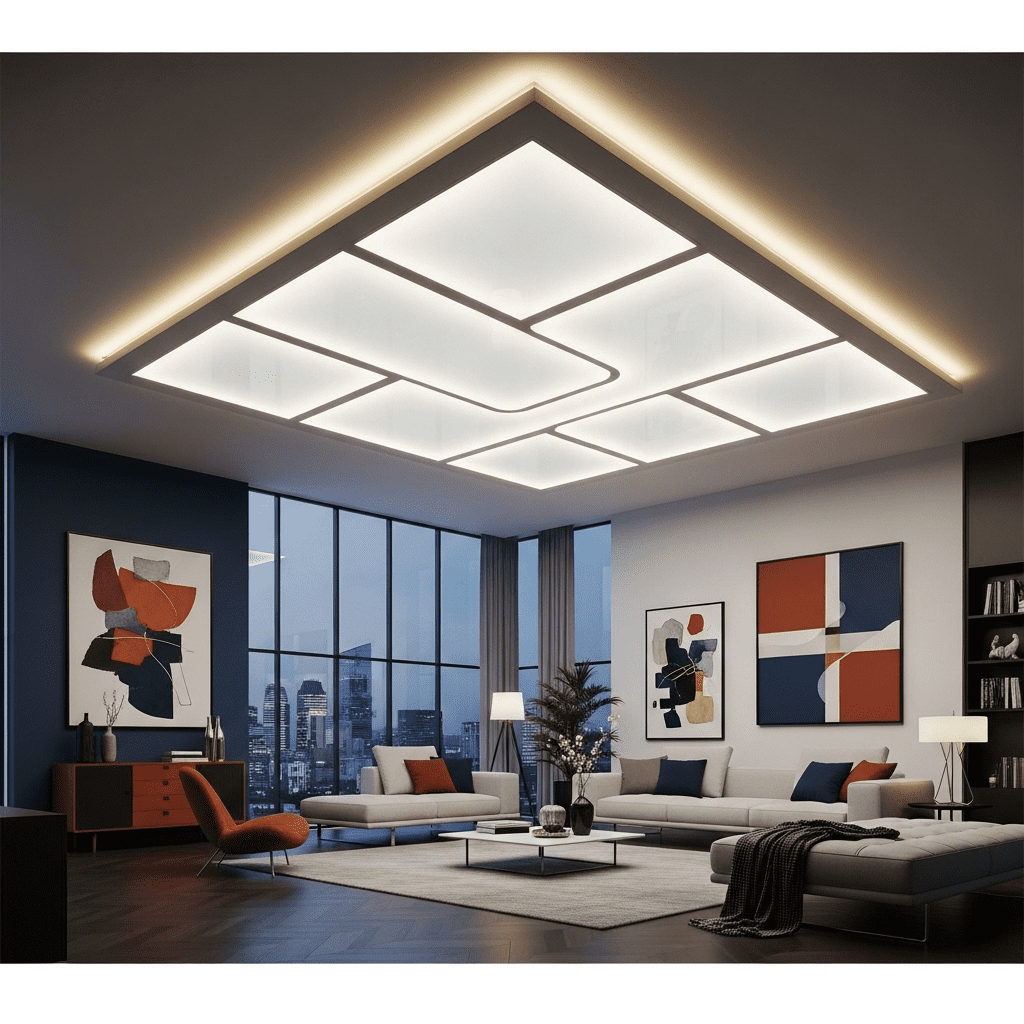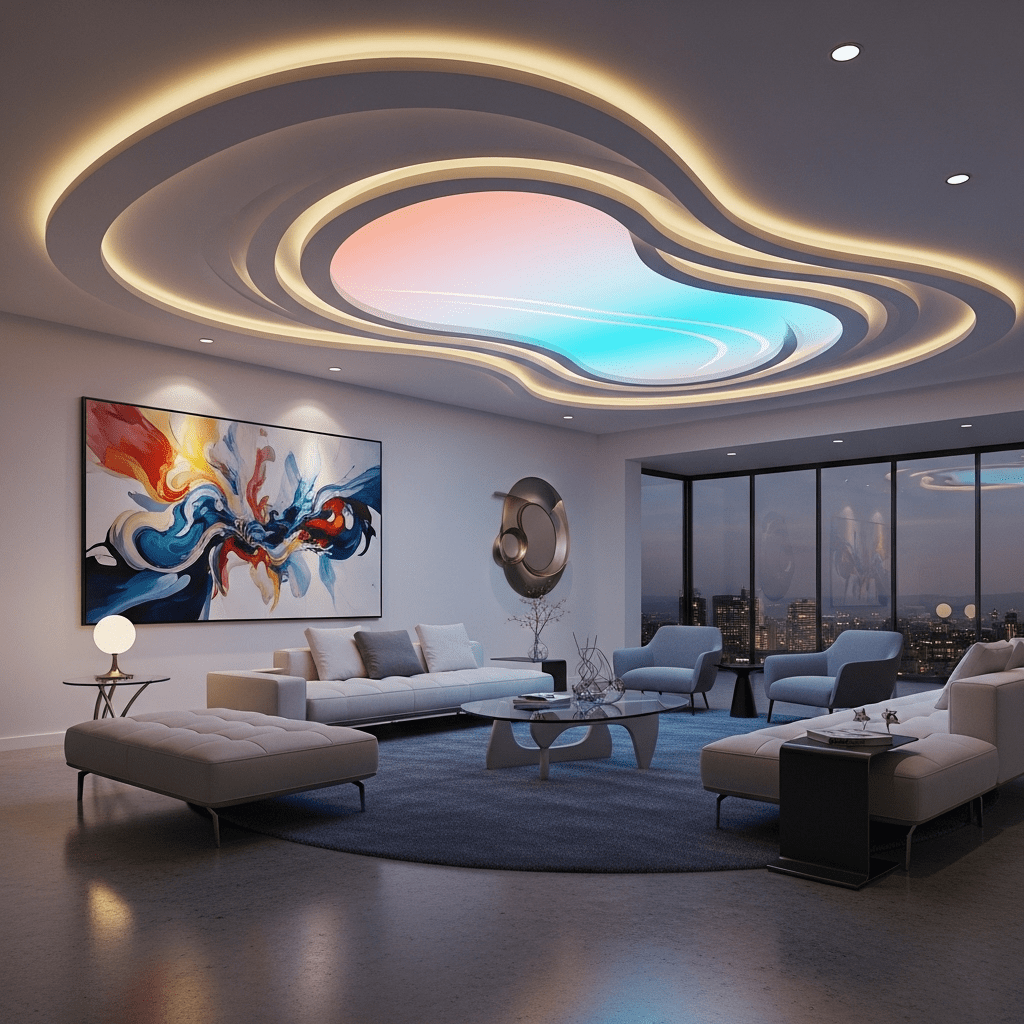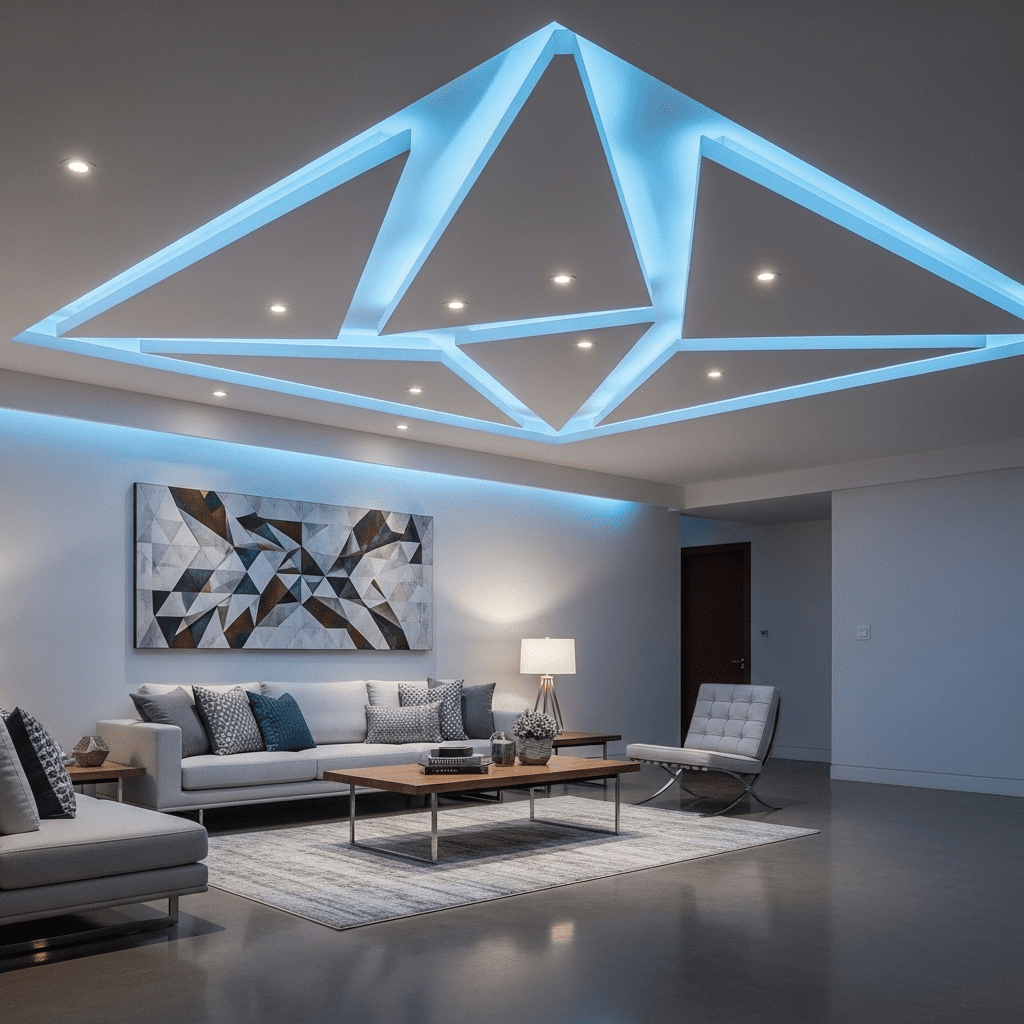Bold geometric shapes cut into the false ceiling create contemporary drama. Triangles, hexagons, or abstract forms add artistic interest and can incorporate colored LED lighting for impact.