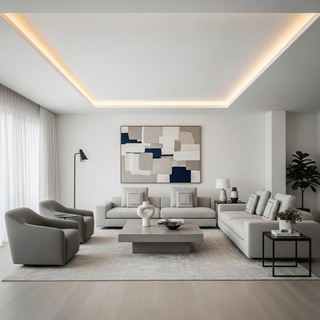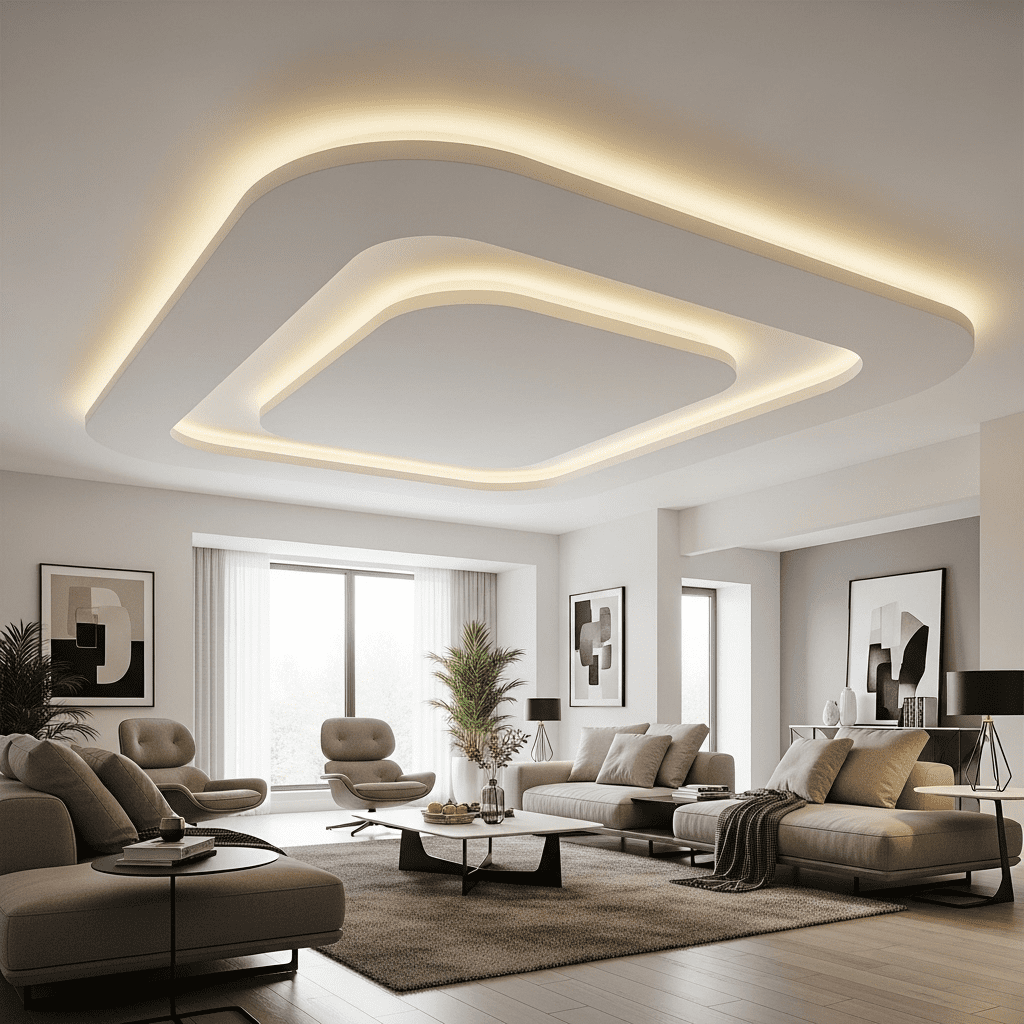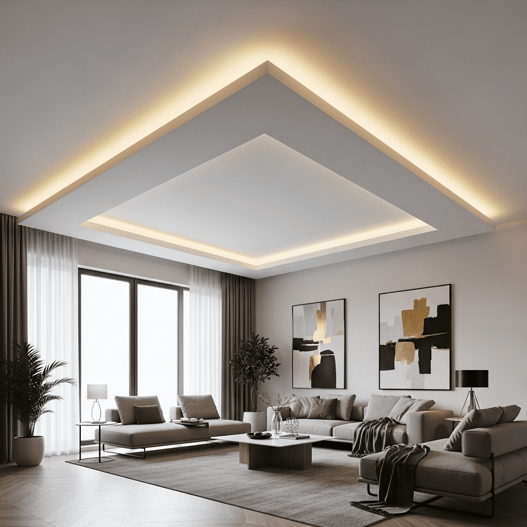 Bold geometric shapes cut into the false ceiling create contemporary drama. Triangles, hexagons, or abstract forms add artistic interest and can incorporate colored LED lighting for impact.