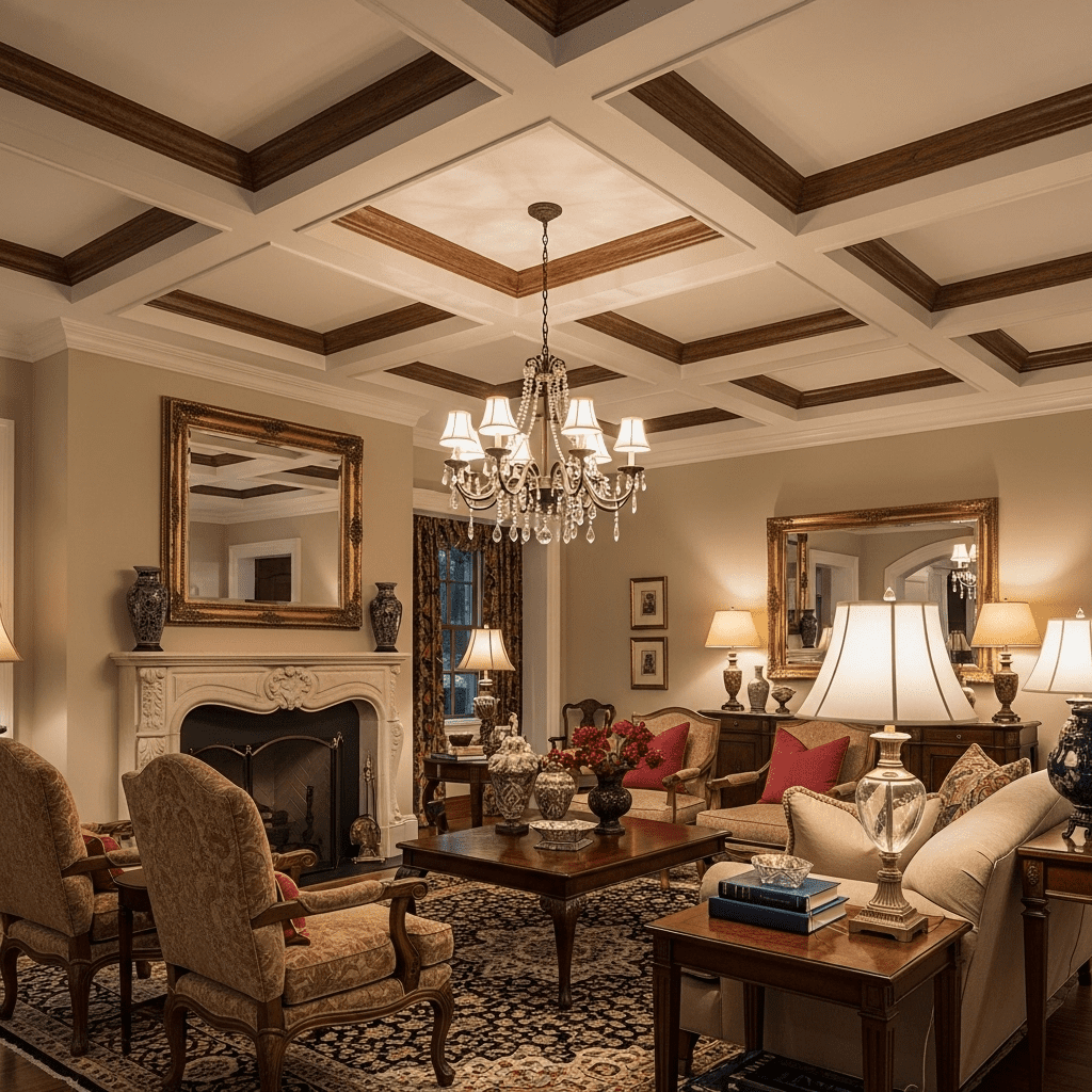 A grid of sunken panels creates a sophisticated, traditional look with three-dimensional appeal. Wooden beams or molded panels form geometric patterns that add elegance and visual weight to the ceiling.