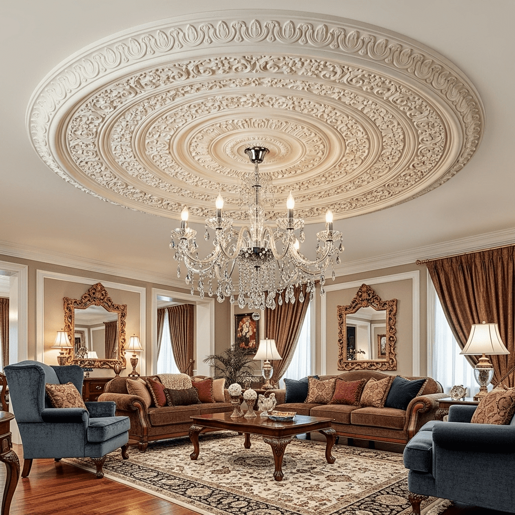 A circular or ornate central design draws the eye upward and frames a statement chandelier. This approach works in both traditional and contemporary settings depending on the medallion’s styling.