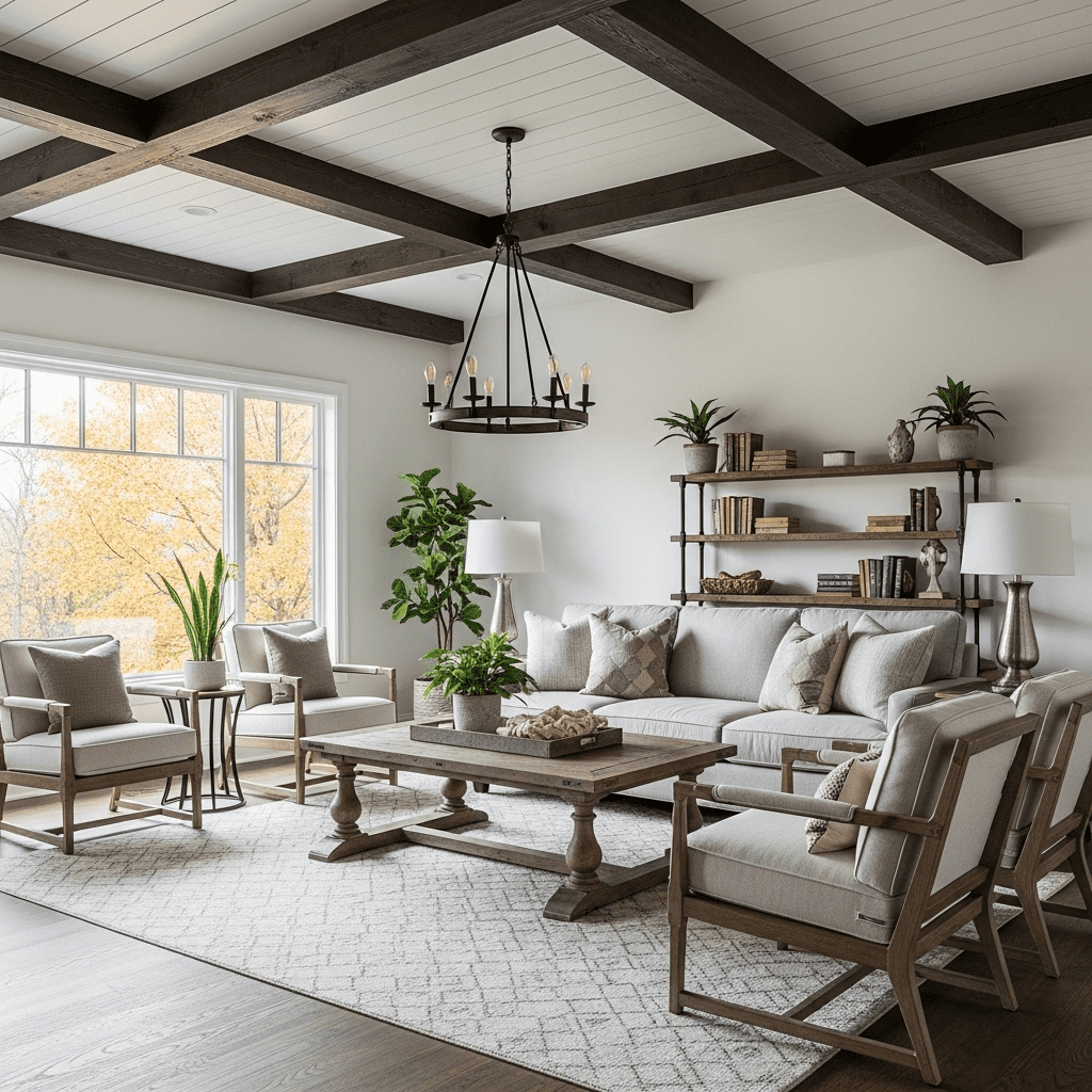 Combining exposed wooden beams with smooth drywall sections balances rustic charm with modern clean lines. This hybrid approach suits farmhouse, transitional, and contemporary rustic styles.