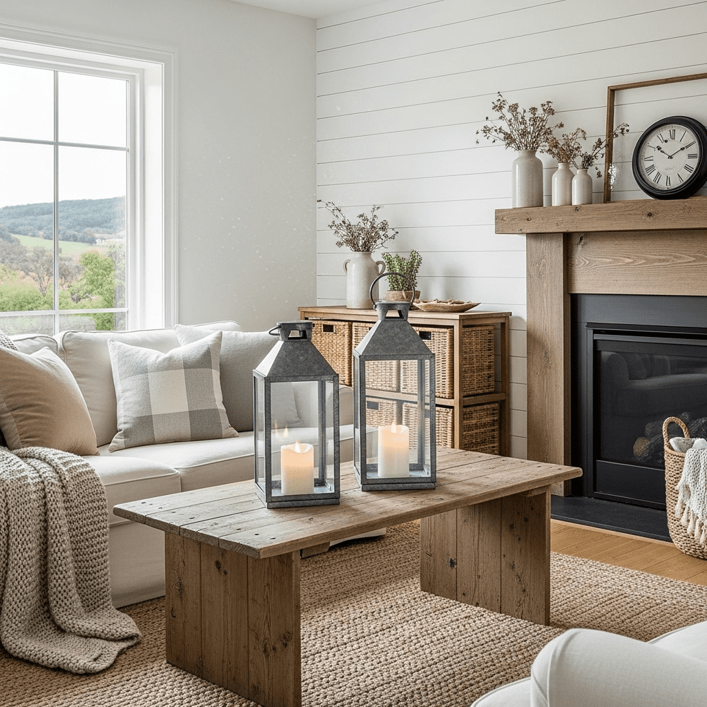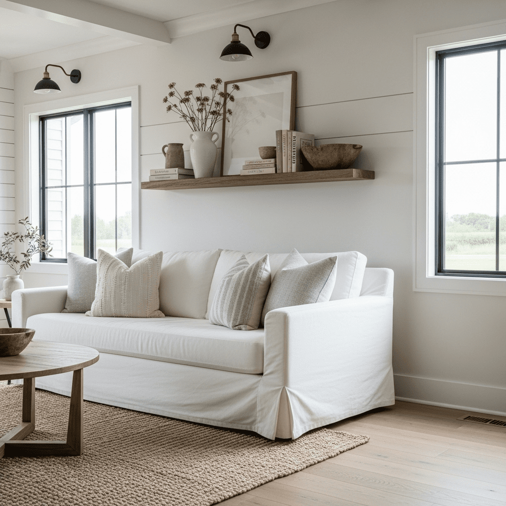 Strip farmhouse tradition down to essentials—clean lines, neutral palette, and select natural material accents. A simple white sofa, minimal wooden shelving, and just a few carefully chosen farmhouse accessories deliver the style’s warmth without visual clutter, perfectly suited to contemporary households wanting countryside charm without full rustic commitment.