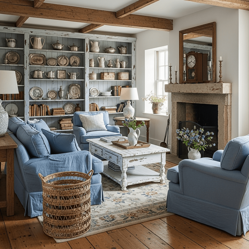 Deliberately worn, painted furniture in soft whites, creamy blues, and muted greens creates the collected-over-generations farmhouse aesthetic. Distressed edges, chipped paint, and visible wear tell comforting stories of family life, making every piece feel treasured rather than simply purchased.