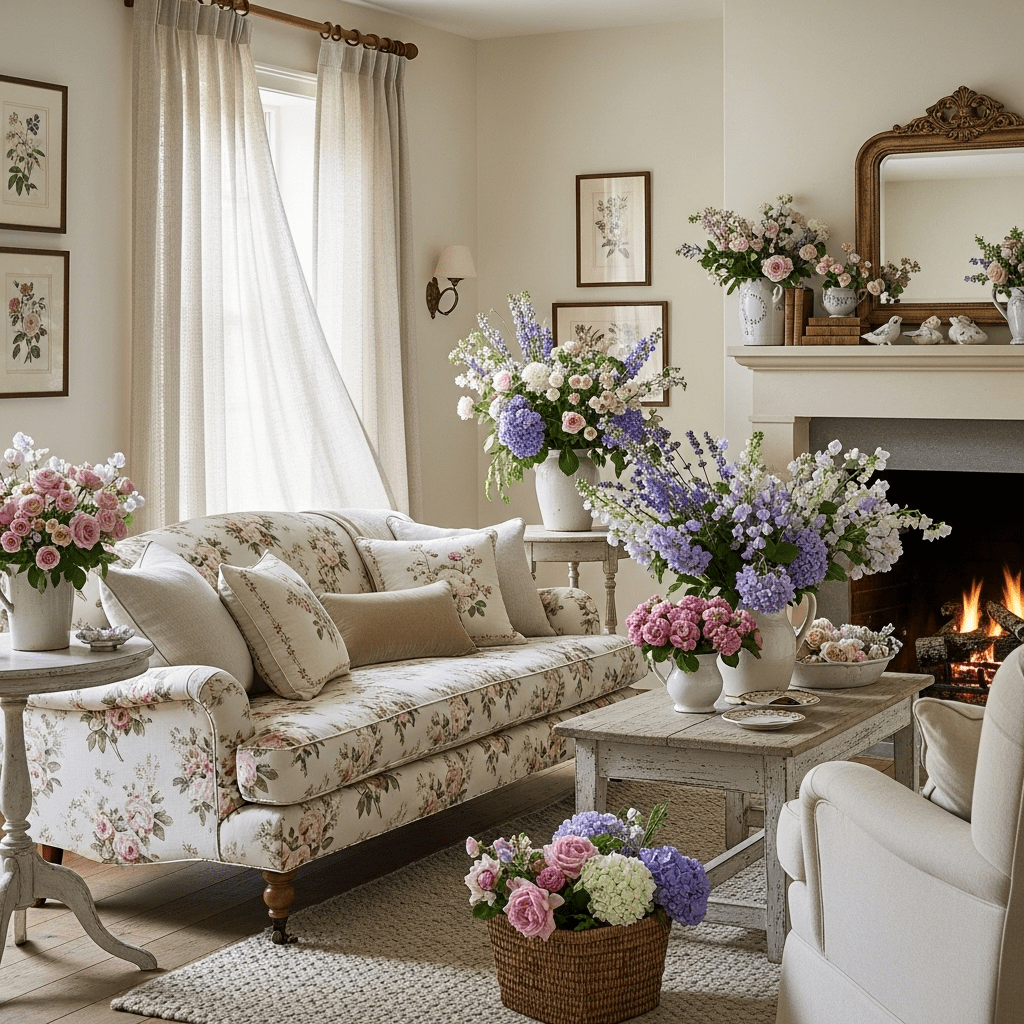 Soft floral fabrics, linen curtains, and garden-inspired accessories create romantically feminine farmhouse spaces. This interpretation draws from English countryside cottages—gentle florals, abundance of fresh flowers, and a relaxed, leisurely atmosphere that invites lingering afternoons spent in comfortable conversation.