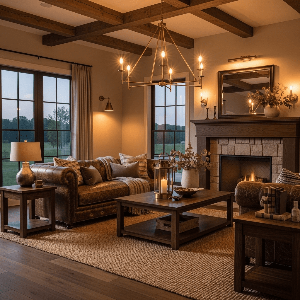 Rich dark walnut and mahogany furniture paired with deep leather sofas creates sophisticated farmhouse luxury. This approach honours traditional craftsmanship through quality wood pieces while maintaining farmhouse character through weathered textures, warm lighting, and understated accessories rather than ornate decoration.