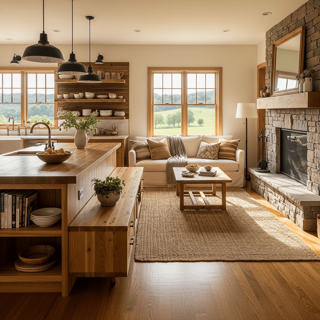 Where kitchen and living areas merge, farmhouse design shines brightest. Butcher block counters, open wooden shelving, and consistent natural materials flow seamlessly between cooking and lounging spaces. This connected layout celebrates family togetherness—the beating heart of authentic farmhouse philosophy.