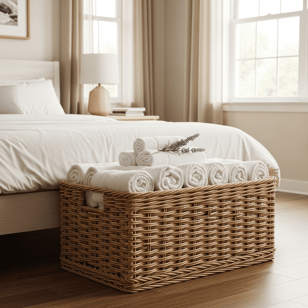 Instead of hiding linens in a closet, roll fresh white towels and place them in a large wicker basket at the foot of the bed. It provides an immediate visual cue of comfort and ensures your guests never have to ask where the bath linens are.