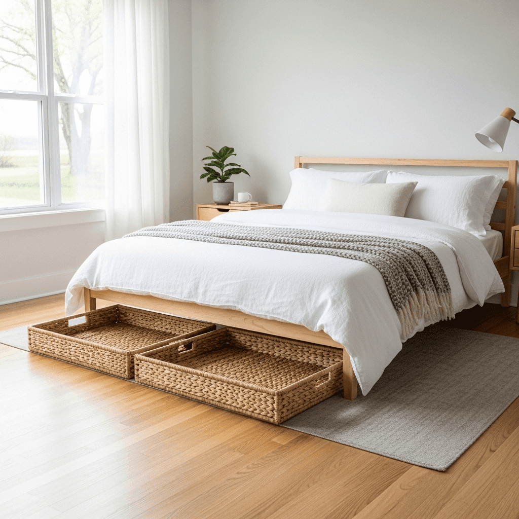 Low-profile, long woven baskets are ideal for the space under the bed. They give guests a designated spot to tuck away their shoes, keeping the main floor area clear of tripping hazards and visual clutter.