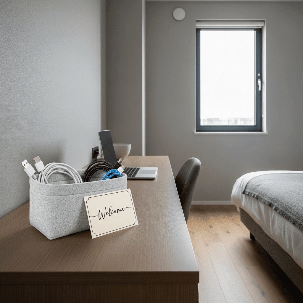 Gather all the “invisible” essentials—like extra charging cables, a universal power brick, and a small card with the Wi-Fi password—into a shallow felt or fabric basket. It keeps tech cords from looking messy on the desk or nightstand.