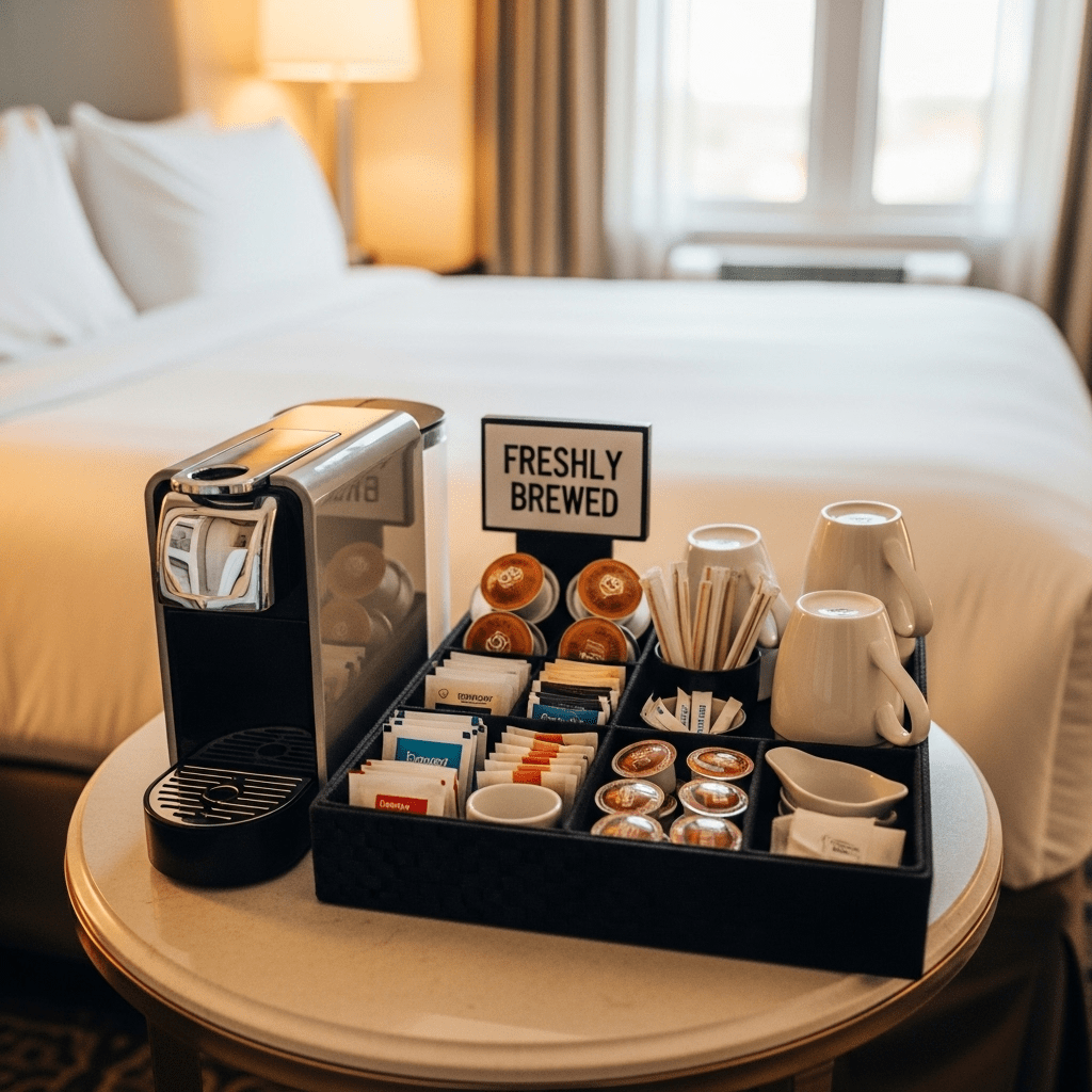 If you have a coffee maker in the guest room, use a partitioned wicker basket to organize pods, stirrers, and sugar packets. It keeps the “bar” area looking like a curated boutique hotel feature.