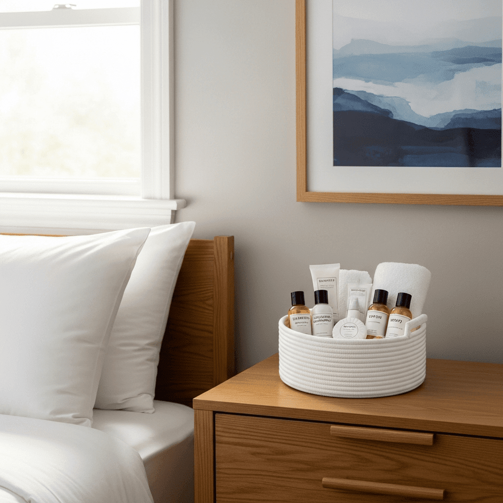 Fill a small coiled cotton basket with travel-sized essentials like toothbrushes, aspirin, and lint rollers. Placing this on the dresser or in the en-suite bathroom saves guests the embarrassment of asking for forgotten items.