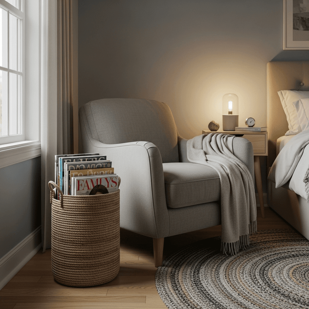 A slim, upright hyacinth basket next to a chair or the bed is perfect for housing a few current magazines or local travel guides. It provides instant entertainment and a touch of “library” charm.