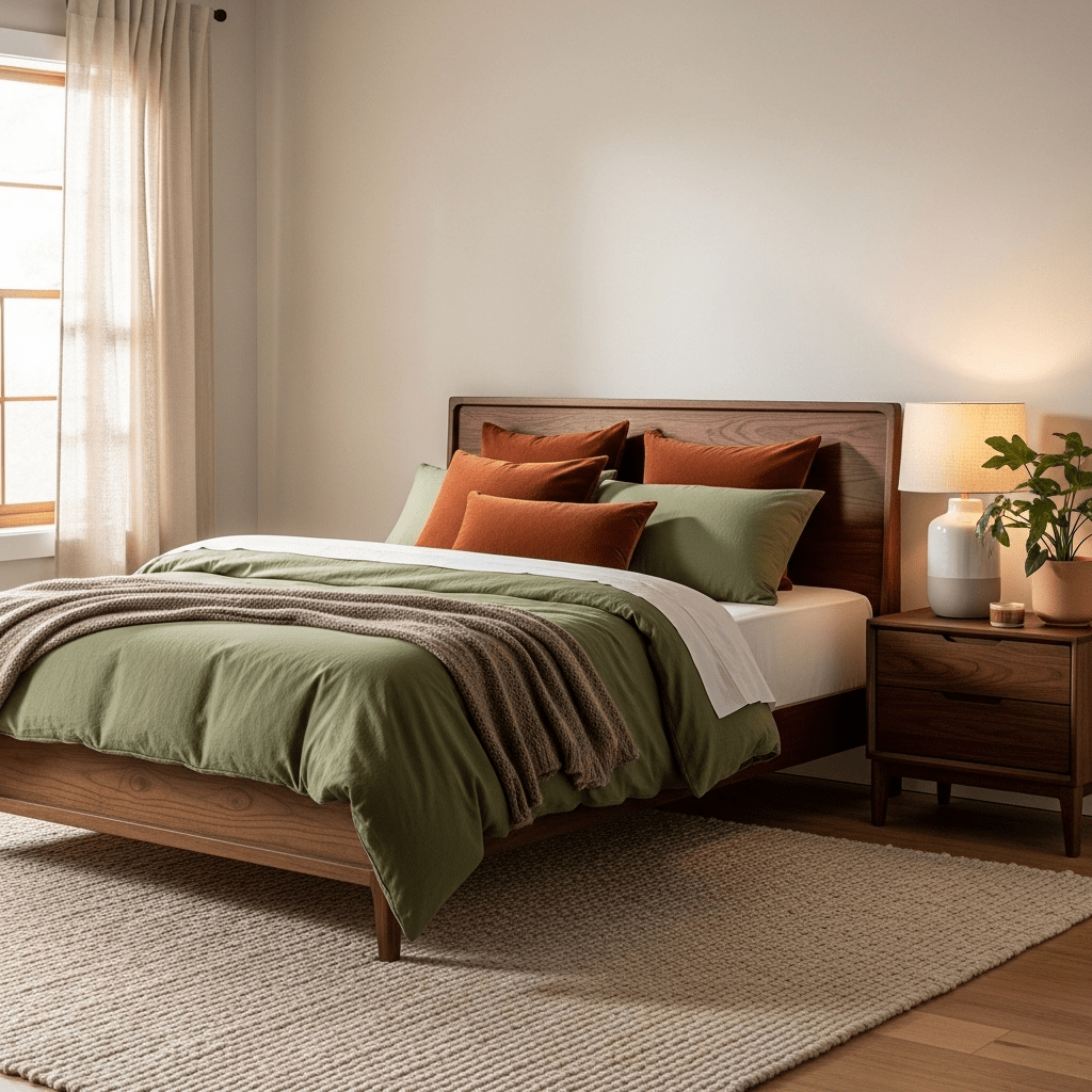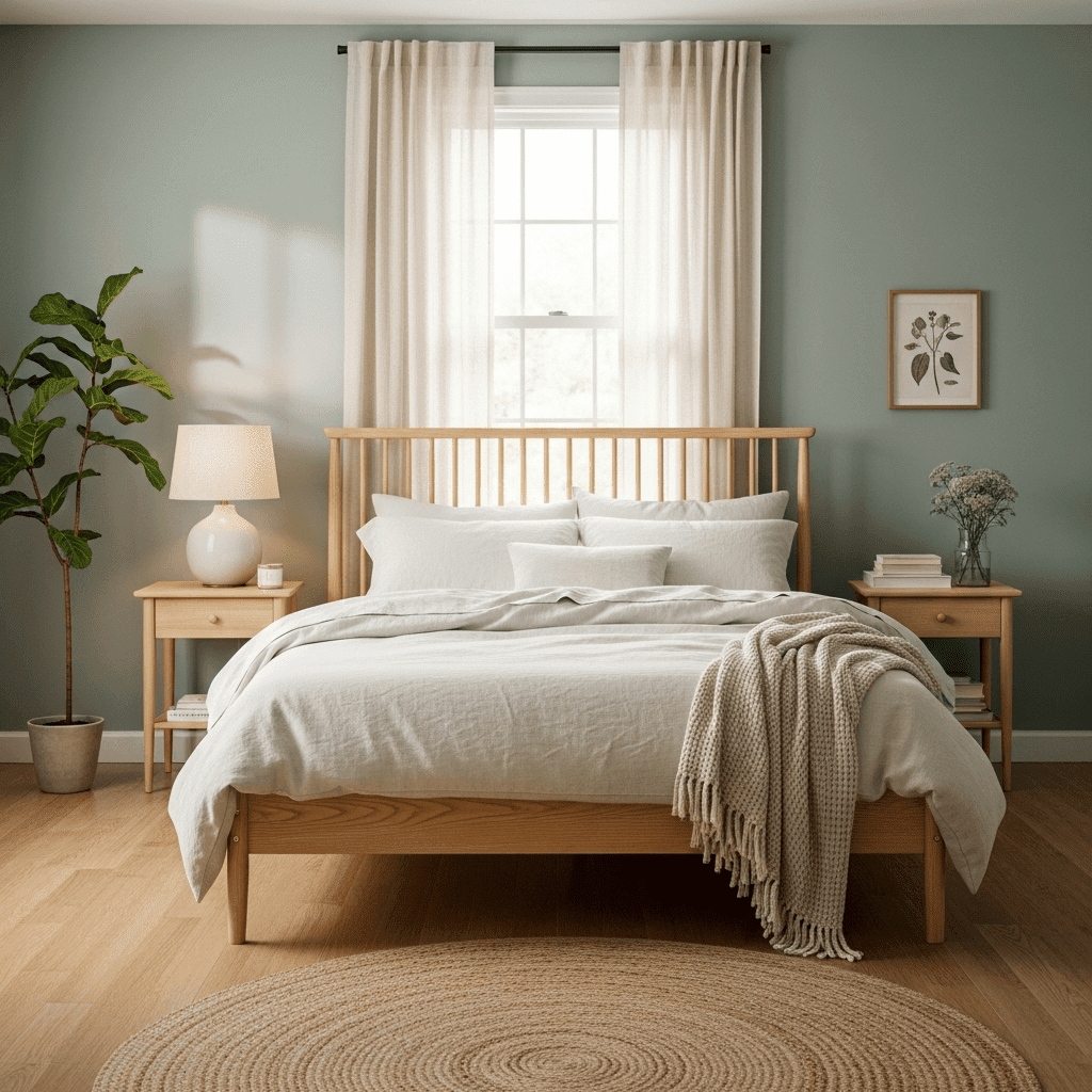 This organic pairing mimics the natural world, offering a grounding and restorative vibe. The coolness of the sage is perfectly balanced by the honey-toned warmth of natural wood furniture.
