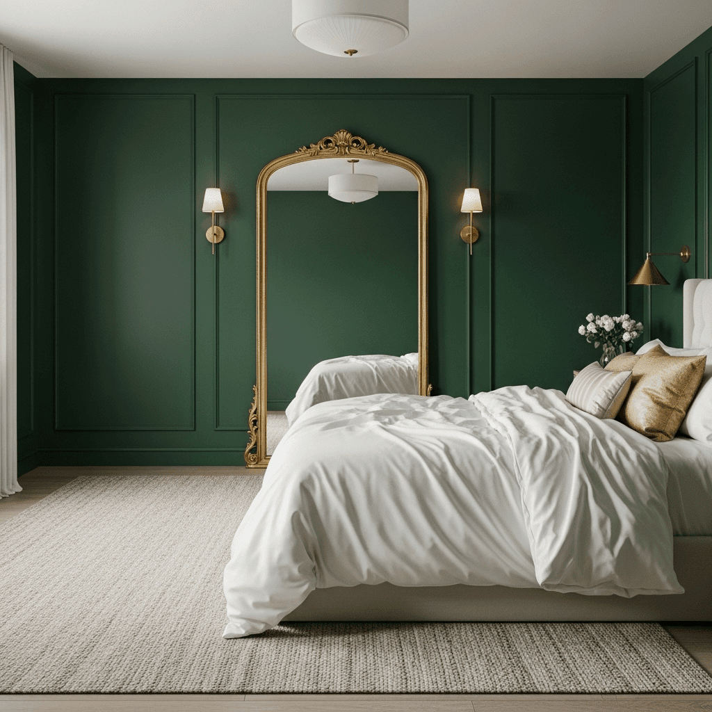 For a guest room that feels like a boutique hotel, emerald green walls paired with gold hardware offer a sense of vintage luxury and drama.