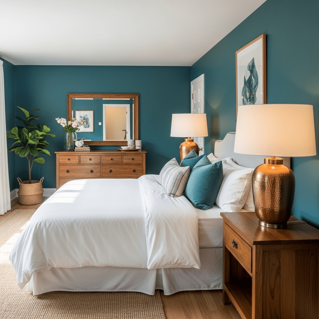 Teal sits between blue and green, offering a saturated but calming look. Copper accents provide a metallic warmth that makes the teal feel even richer.