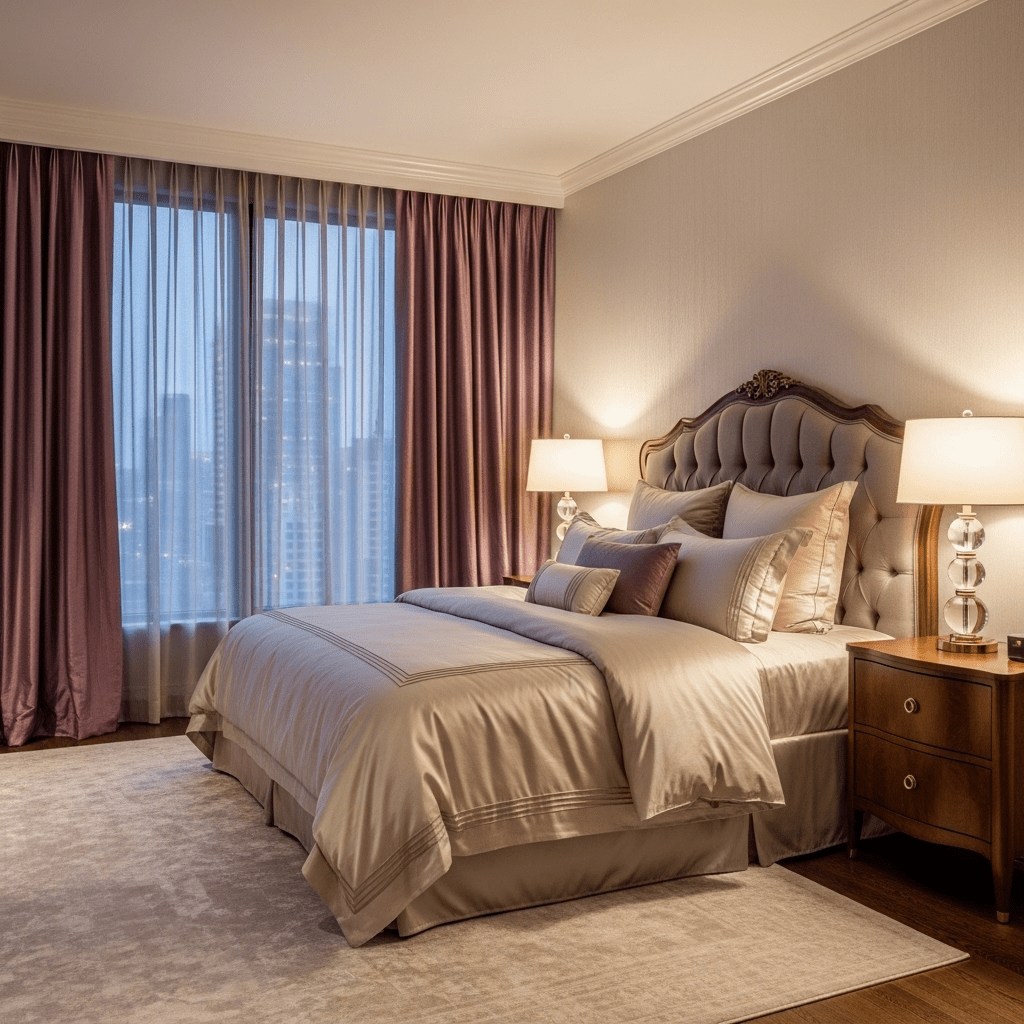 A royal, feminine palette that feels luxurious and intimate. Champagne-colored silks provide a shimmering contrast to the matte depth of plum walls.