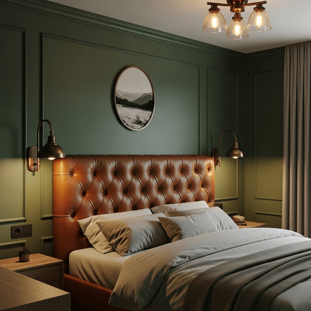 This combination feels like a classic library or a mountain lodge. The deep green is masculine and sturdy, while cognac leather adds a touch of refined comfort.