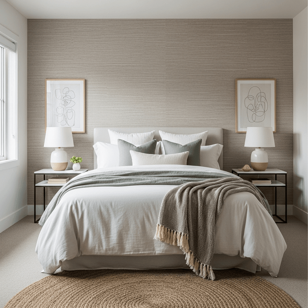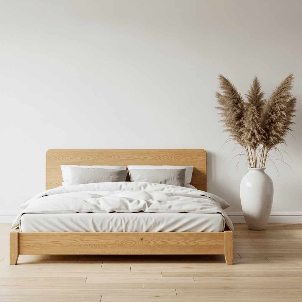 Focus on “less is more” by using a few high-quality pieces made from natural materials. A platform bed, a simple clay vase with dried branches, and a neutral wool throw define this calm aesthetic.