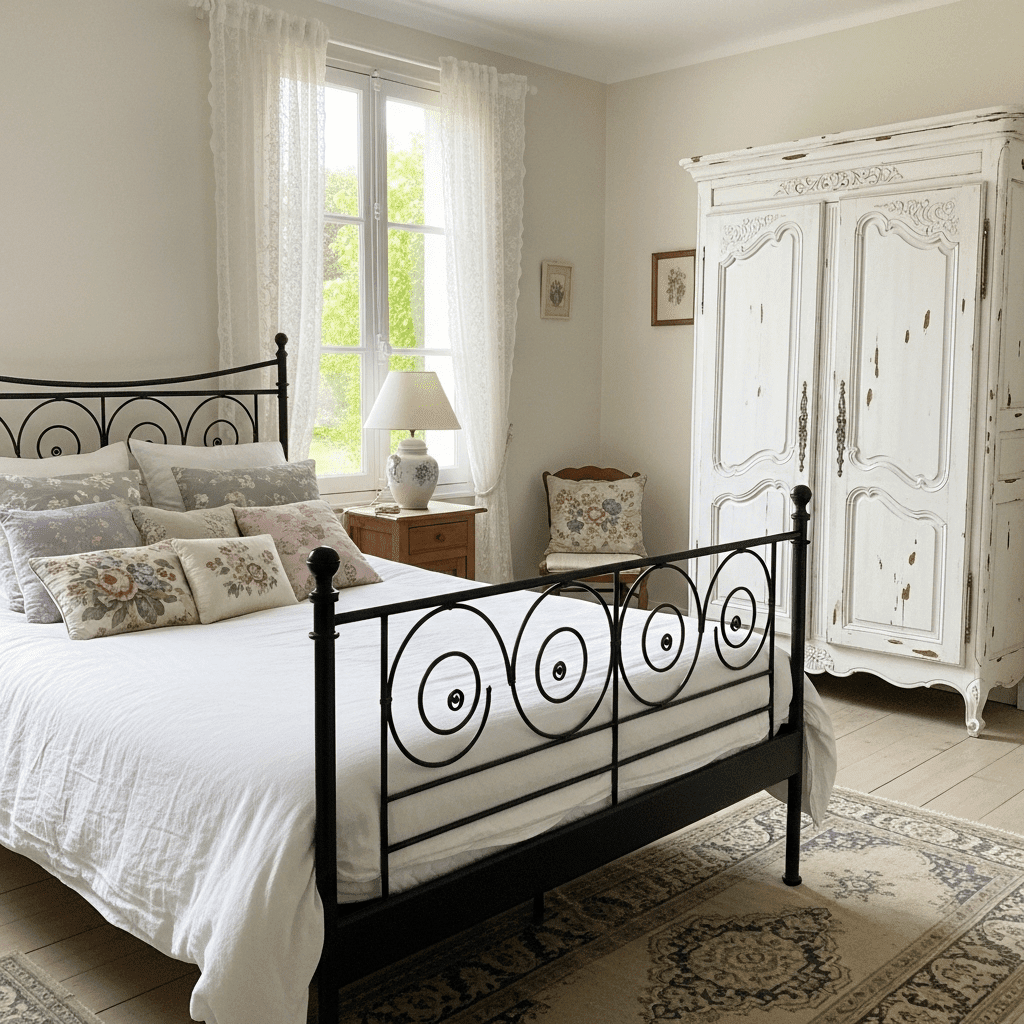 This romantic design features ornate wooden furniture, floral prints, and soft pastel tones. Toile fabrics and a wrought-iron bed frame add a timeless, rustic elegance to the space.