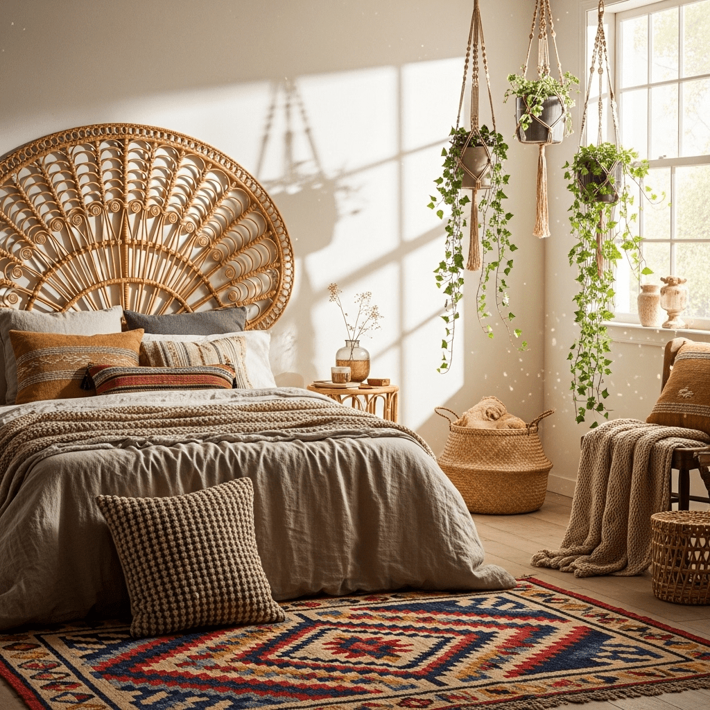 Layered textiles, colorful patterns, and plenty of indoor plants make for a vibrant and soulful room. Use a rattan headboard and macramé wall hangings to enhance the global, eclectic feel.