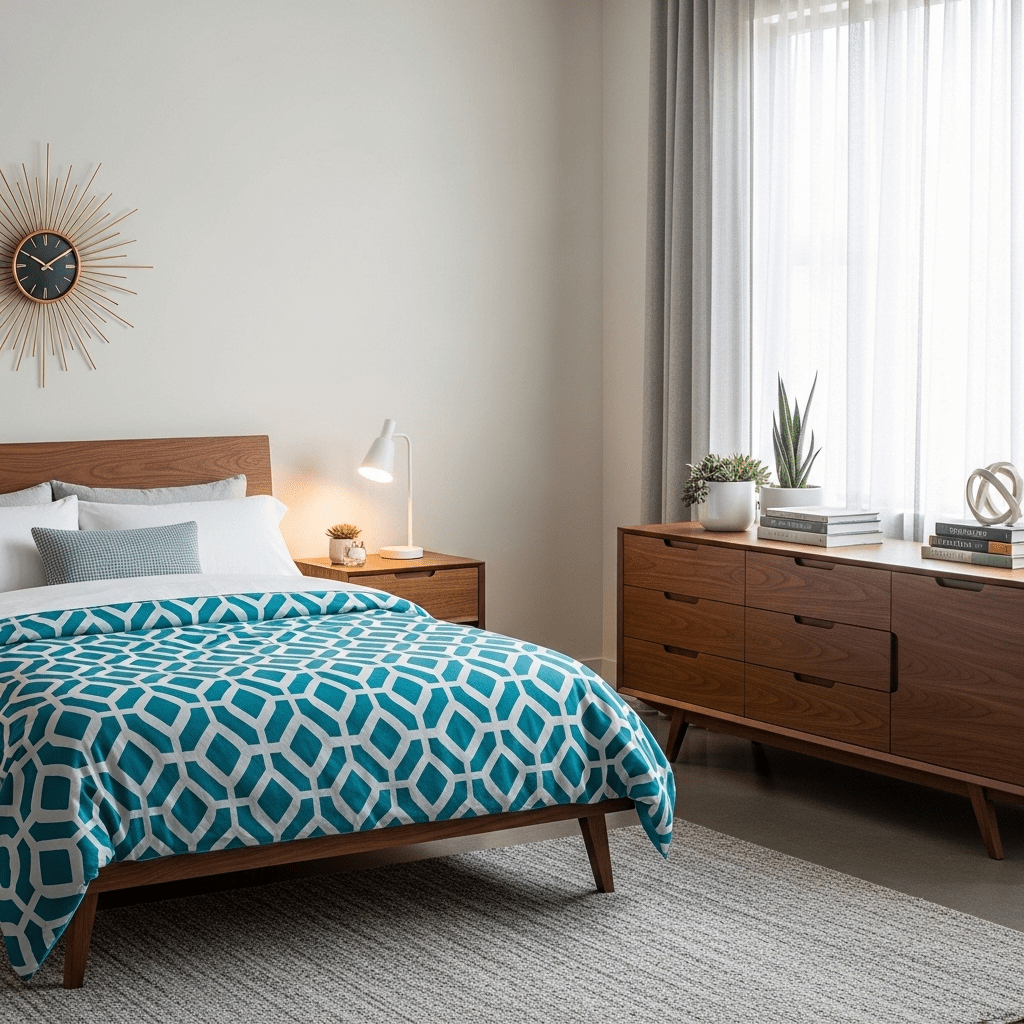 Celebrate the 1950s and 60s with tapered furniture legs, geometric art, and pops of burnt orange or teal. This style feels nostalgic yet fresh and works exceptionally well in smaller rooms.