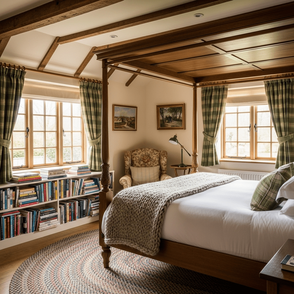 Cozy and a bit cluttered in the best way, this design uses checked fabrics, botanical prints, and built-in bookshelves. It’s a warm, “lived-in” look that feels incredibly welcoming.