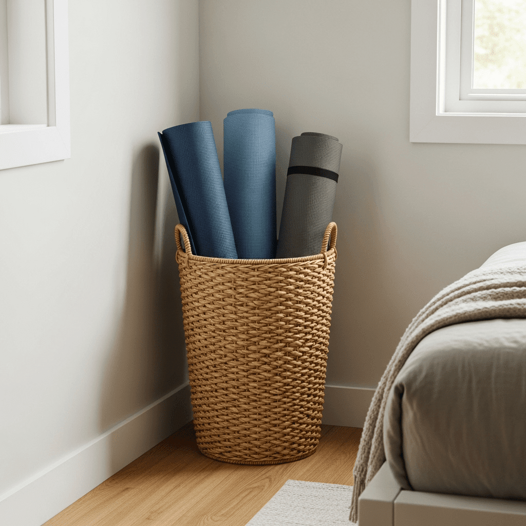 Use a stylish tall basket or a dedicated wall-mounted “wine rack” style holder for yoga mats. It keeps them off the floor and prevents them from unrolling, maintaining a tidy appearance.