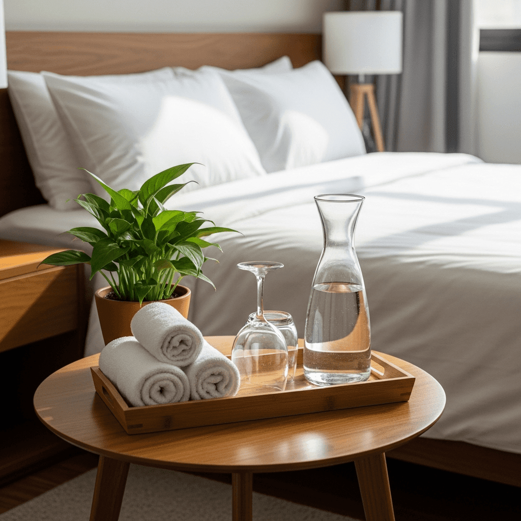Choose bedding and curtains in high-performance, moisture-wicking fabrics that are easy to wash. Keeping the color palette neutral (whites, greys, and woods) helps bridge the gap between “spa” and “studio.”