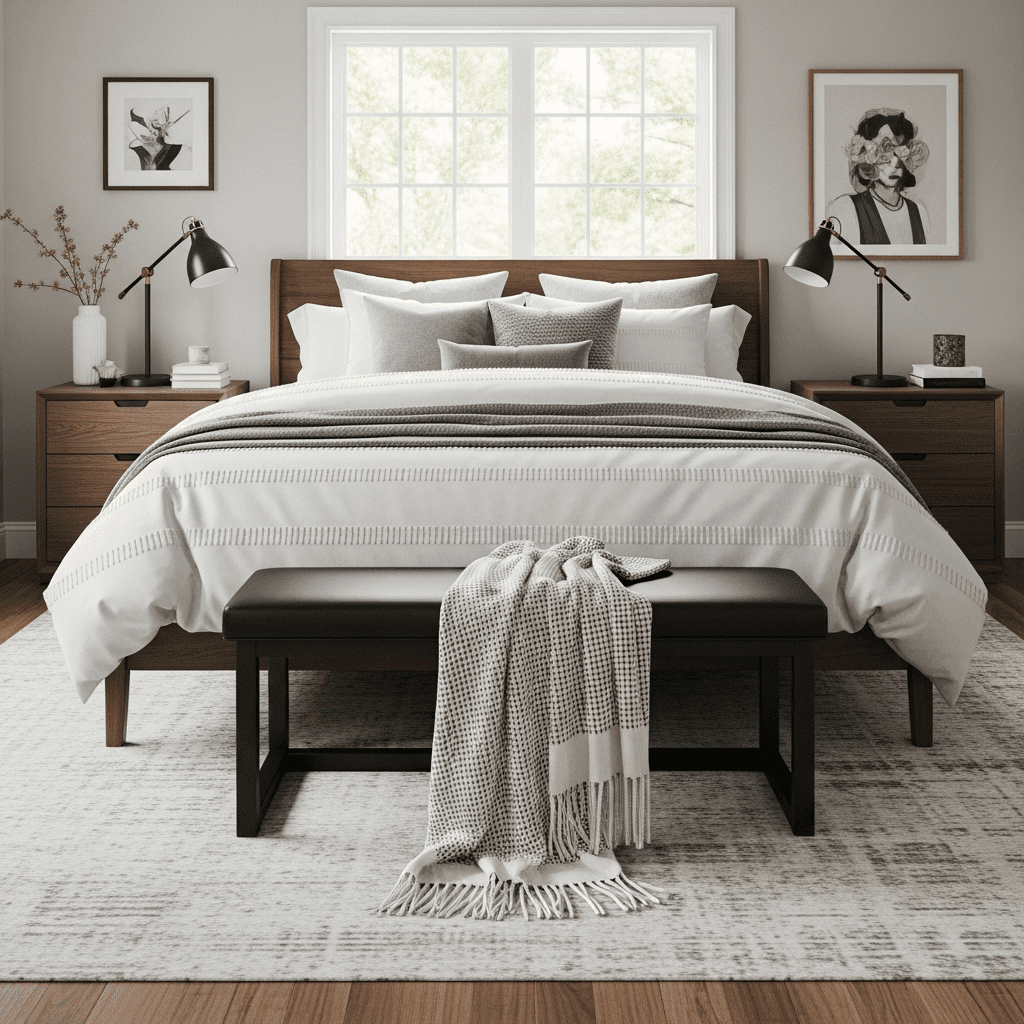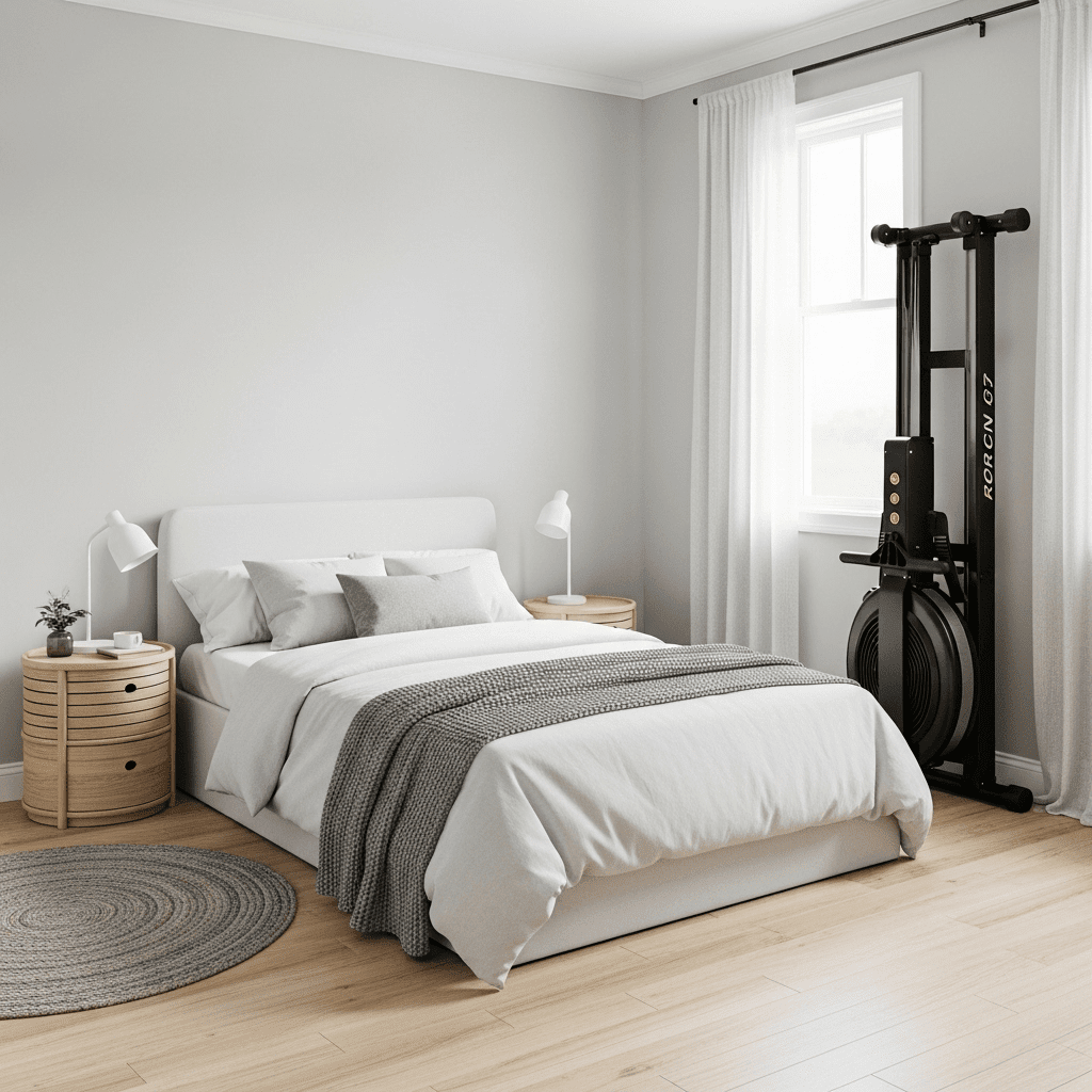 Layer a large, plush area rug over a section of high-density rubber gym flooring. This provides the “grip” needed for heavy lifts in one area while maintaining the soft, cozy feel of a bedroom in the sleep zone.