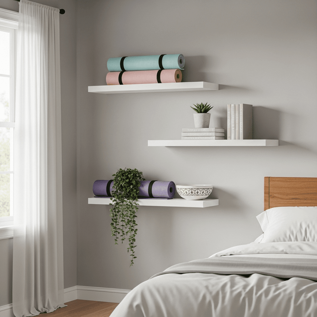 Use high floating shelves to store items like foam rollers and yoga wheels. When arranged neatly among a few books or plants, these items blend into the room’s decor rather than looking like clutter.