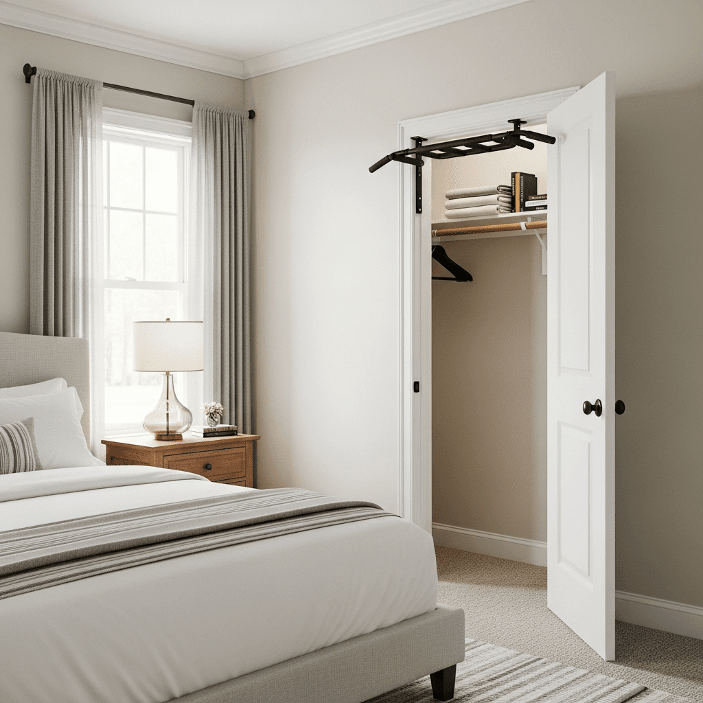 Install a sturdy, permanent pull-up bar in the closet doorway rather than the main room entry. It stays out of the immediate sightline of guests while remaining perfectly functional for your daily routine.