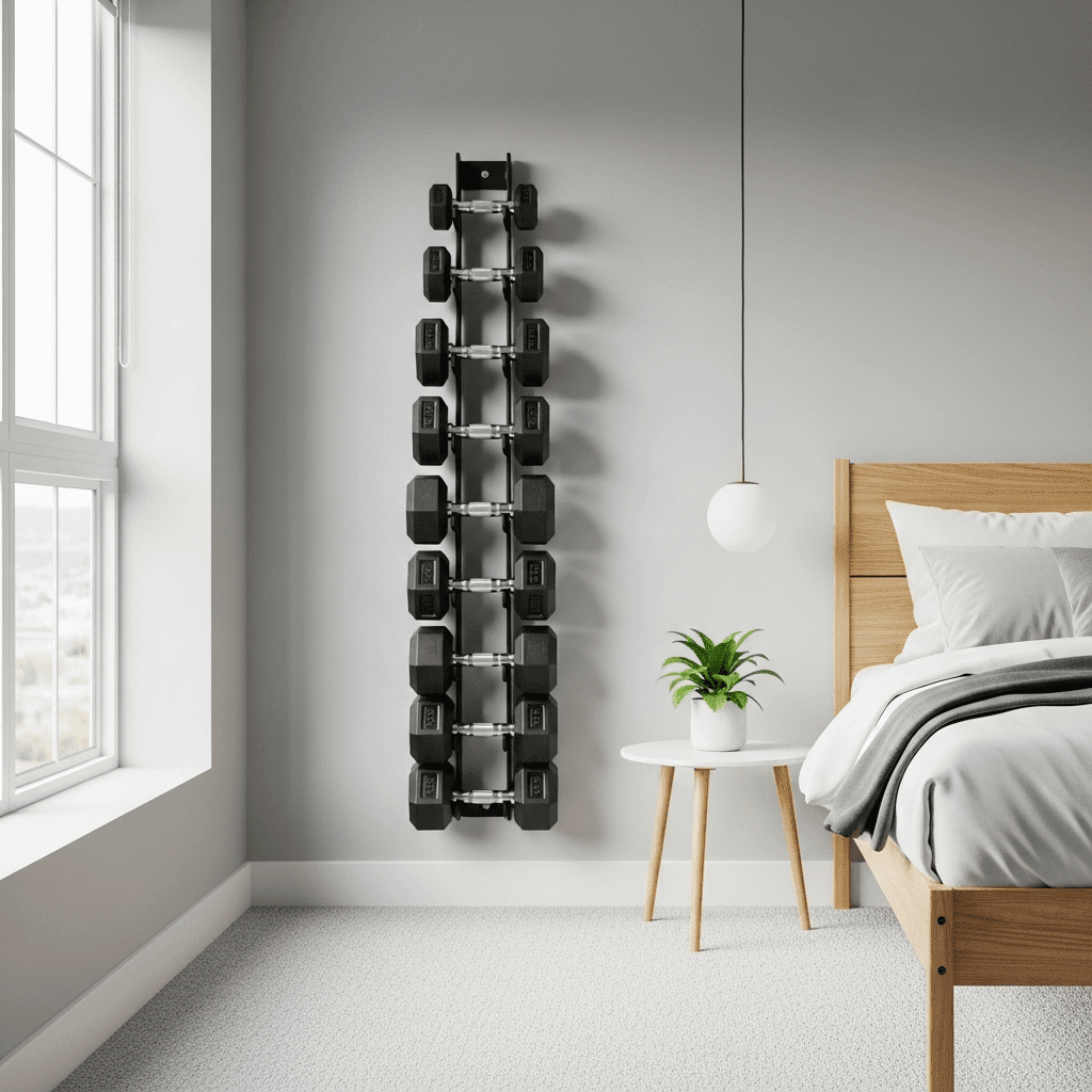 Ditch the messy floor racks for architectural wall-mounted storage. Choosing weights in consistent colors (like all-black or chrome) turns your equipment into a modern industrial art installation.