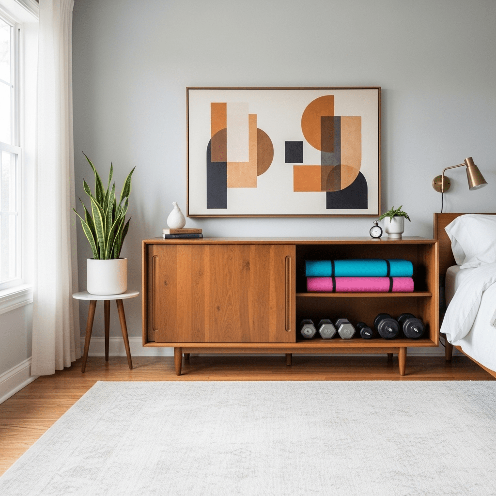 Use a long, stylish sideboard or credenza to hide smaller gym essentials like yoga blocks, resistance bands, and kettlebells. Guests will see a beautiful piece of furniture, while you have easy access to your gear.